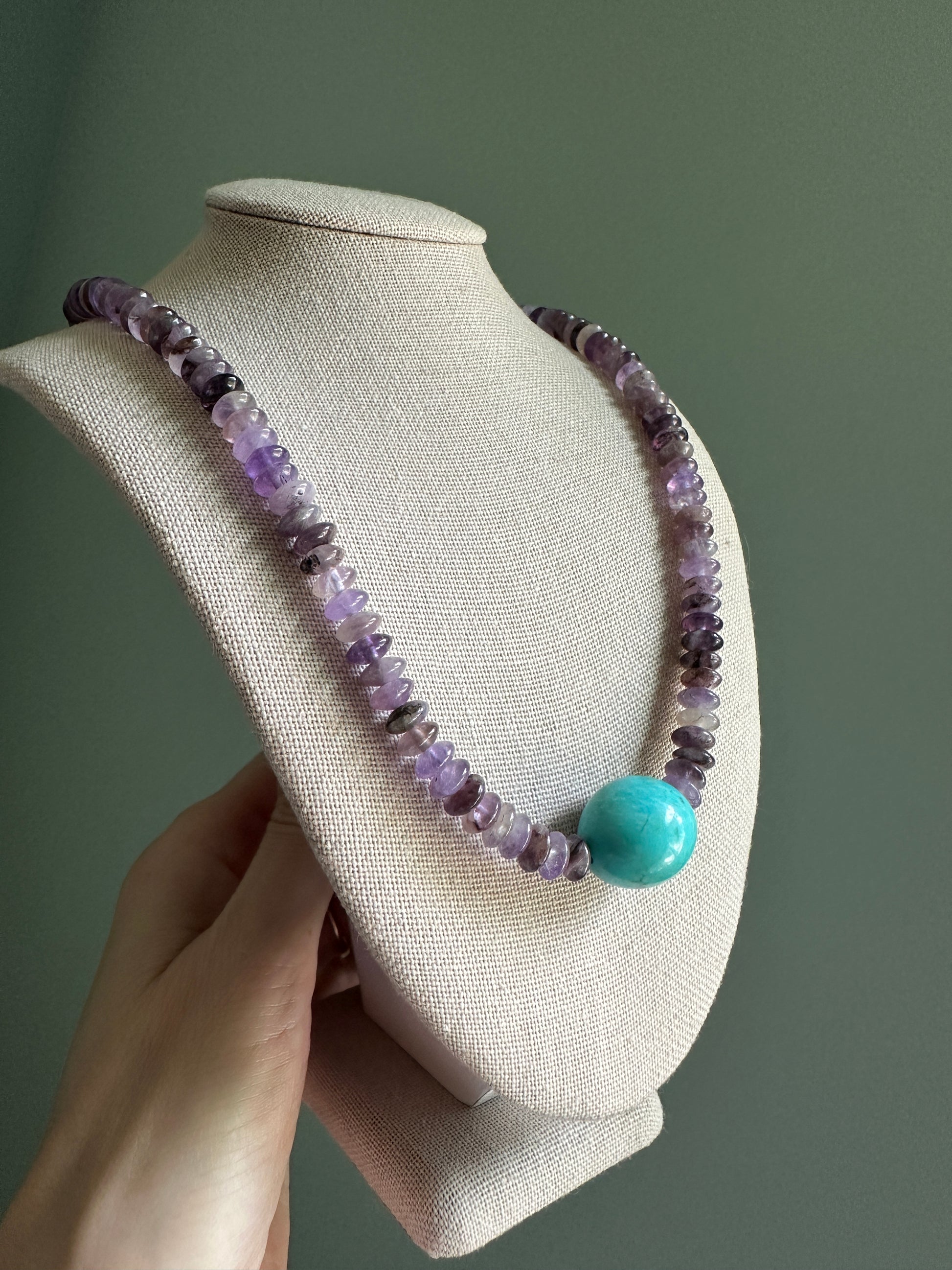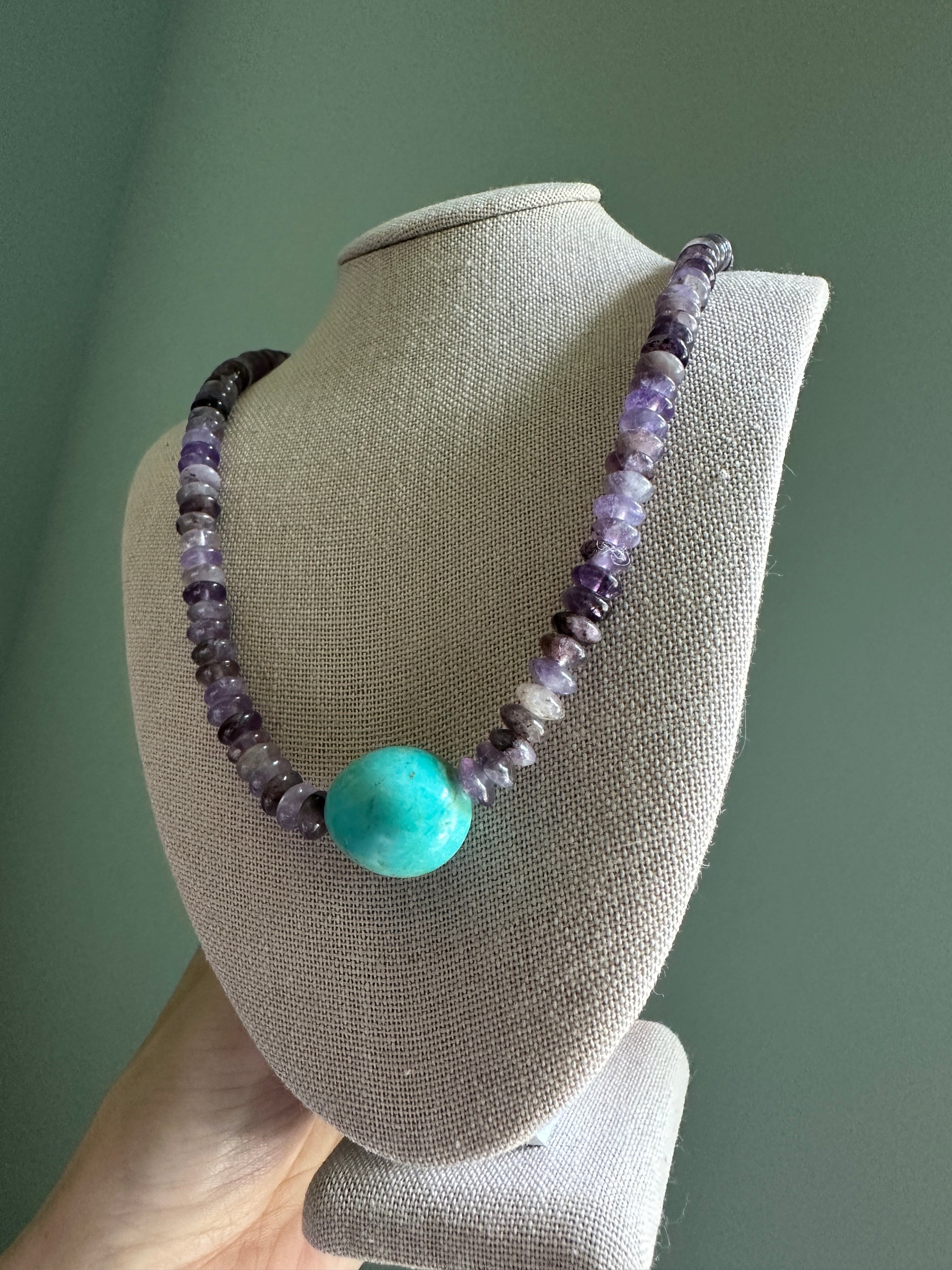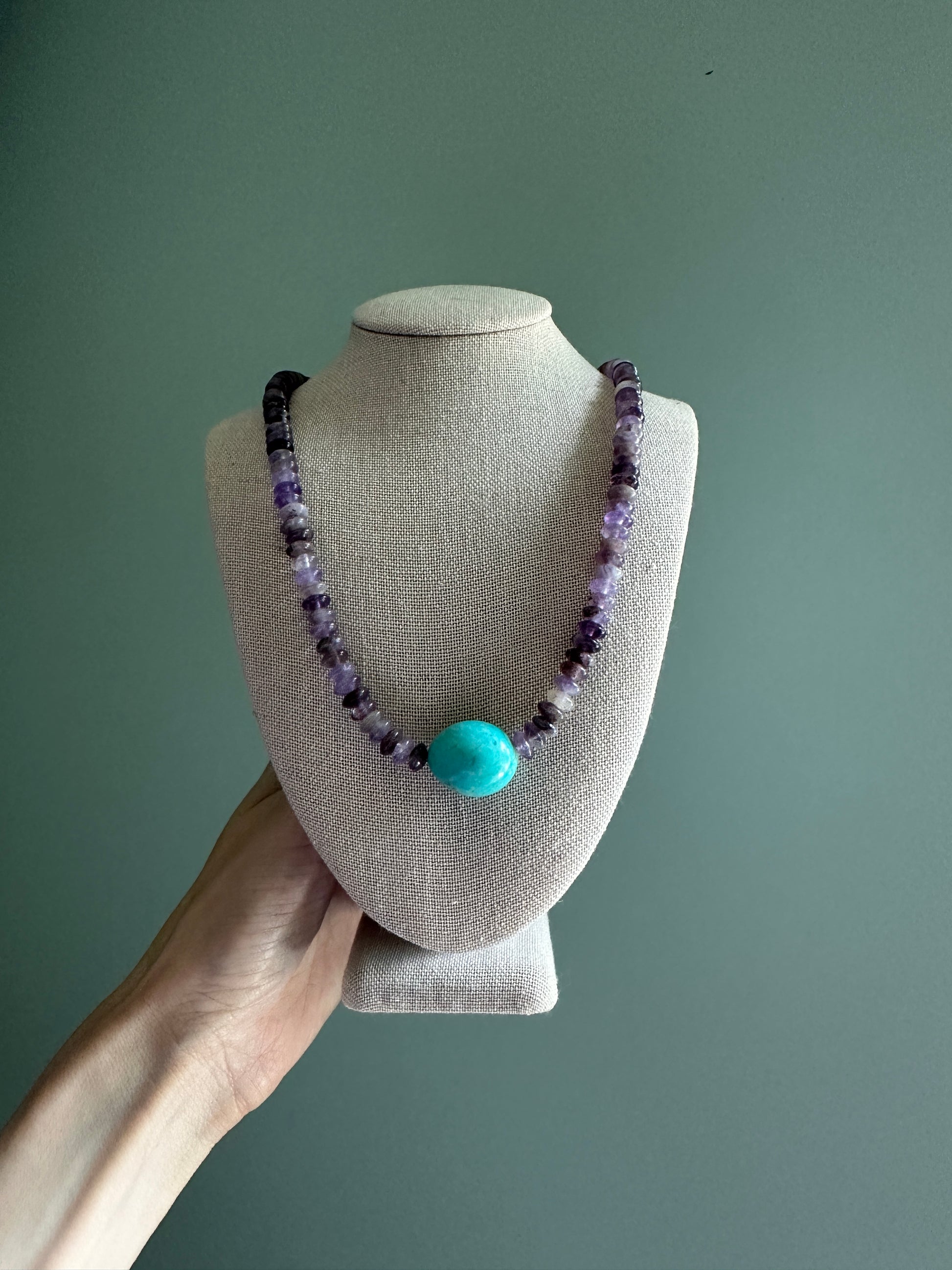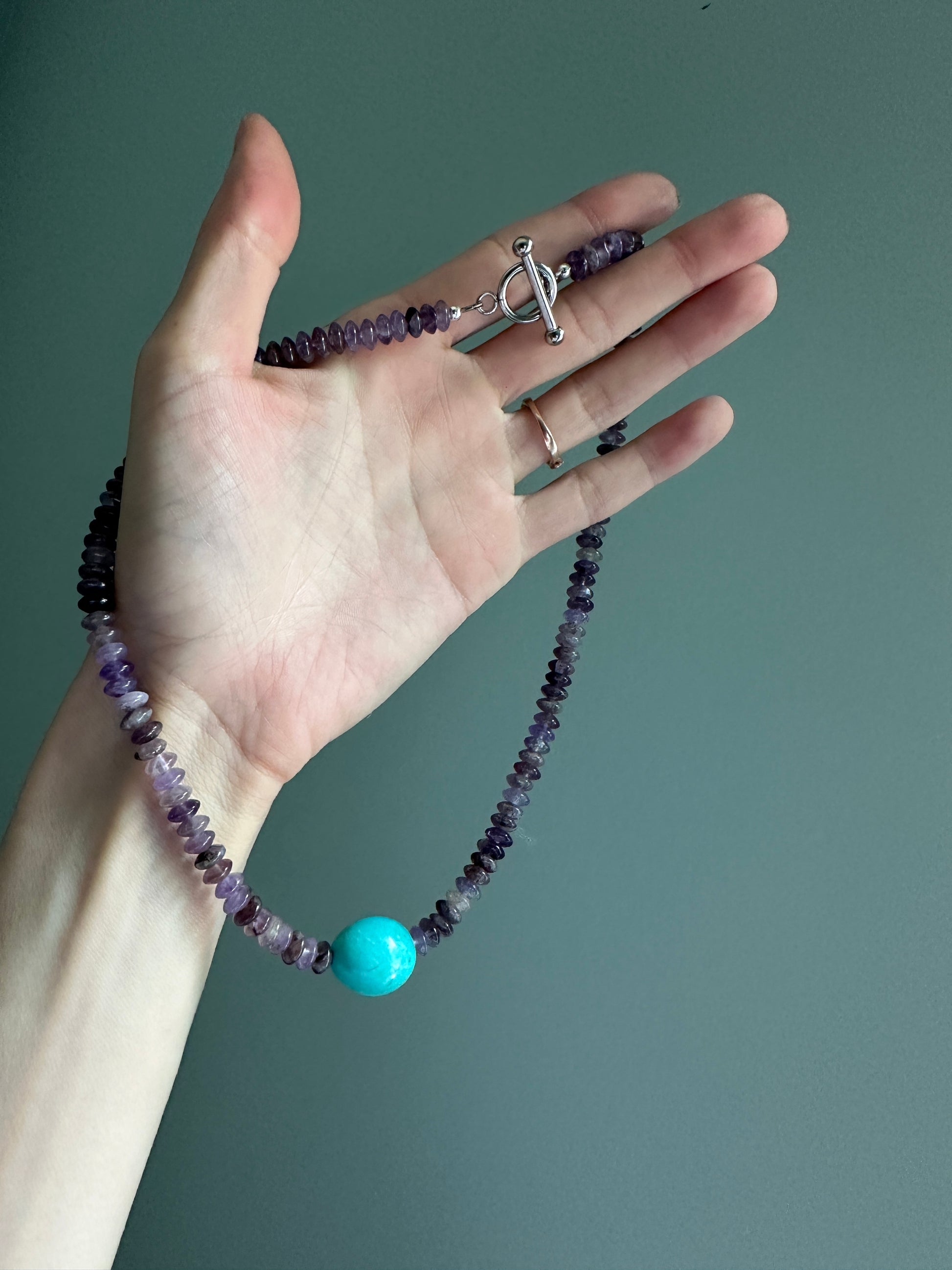 Rich, regal, and undeniably striking, this one-of-a-kind necklace combines the deep, moody purples of genuine amethyst with the bright pop of a Kingman turquoise nugget. The faceted rondelle shape of the amethyst beads adds texture and shimmer, while the turquoise focal bead draws the eye with its bold, sky-meets-ocean hue.