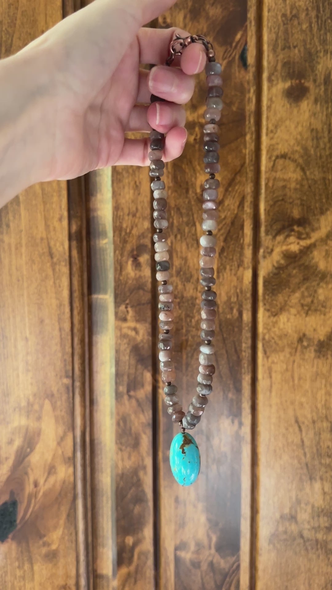Brown moonstone is a gemstone you don’t come across every day, especially in chunky, hand-faceted form. Pairing it with high-quality Kingman turquoise—a stone sourced from one of the most storied turquoise mines in the U.S.—creates a combination that’s not only striking, but incredibly rare in the world of jewelry. This is a true one-of-a-kind design, hand-strung and finished with warm copper findings and a comfortable extender chain.