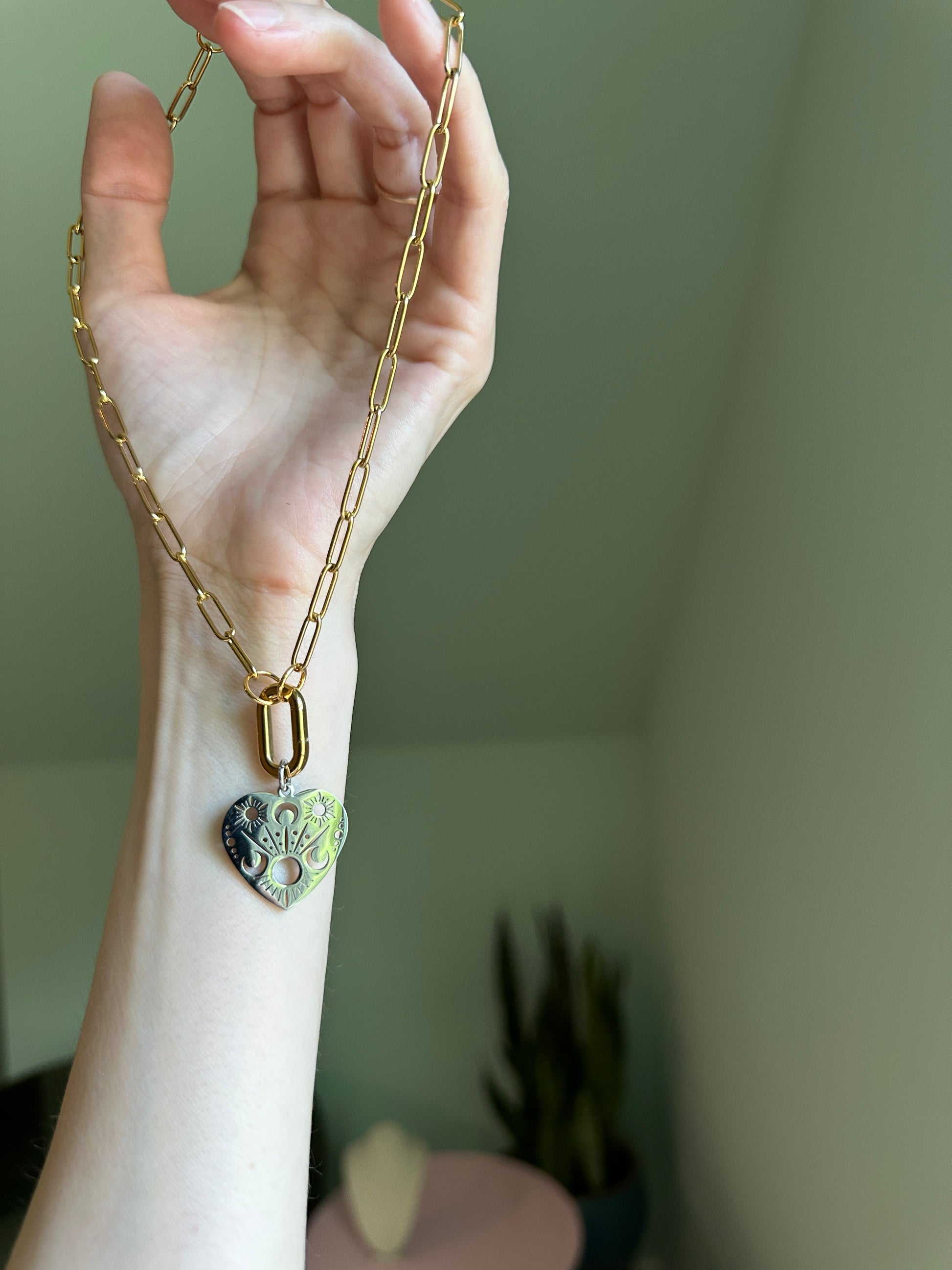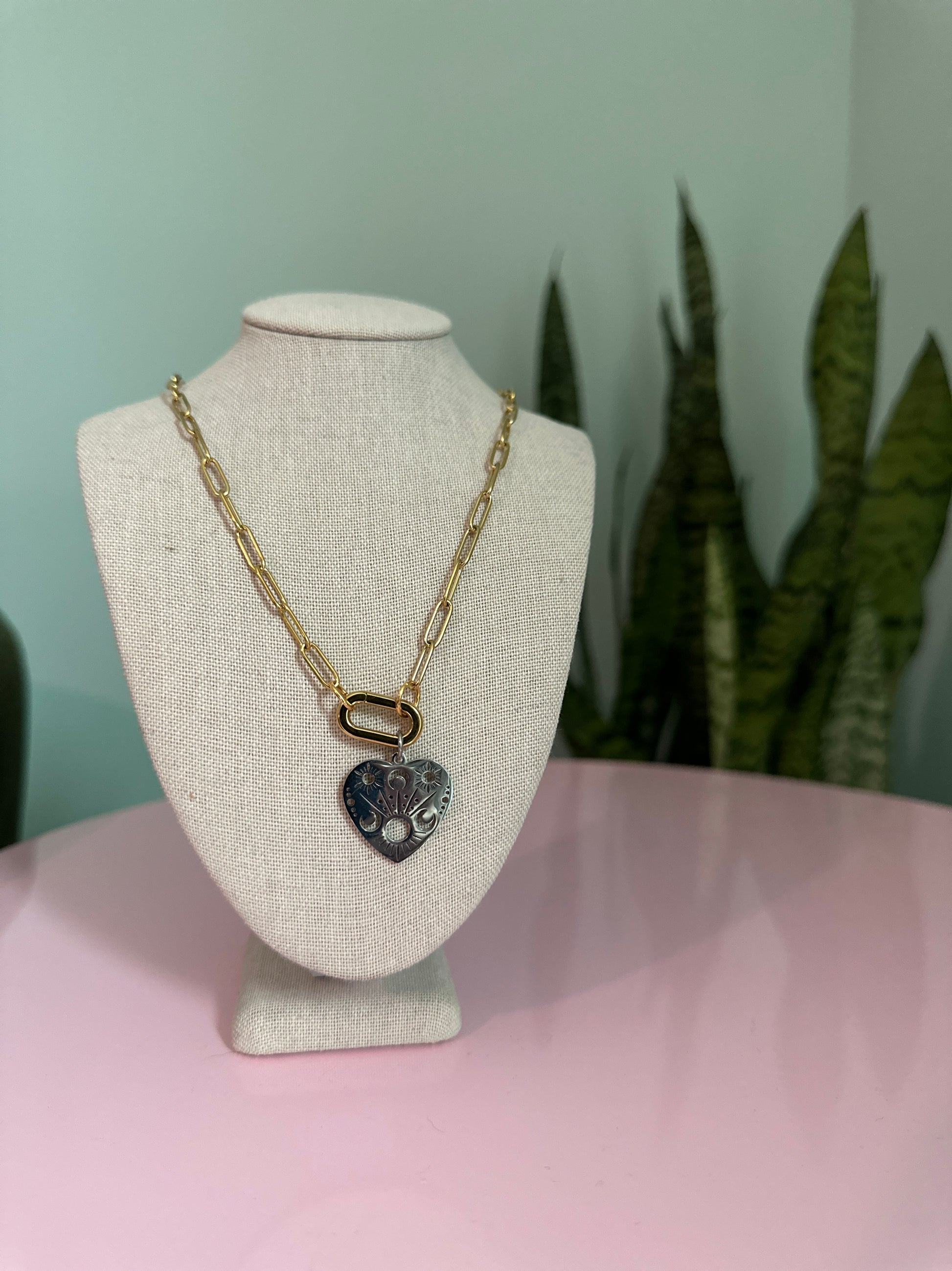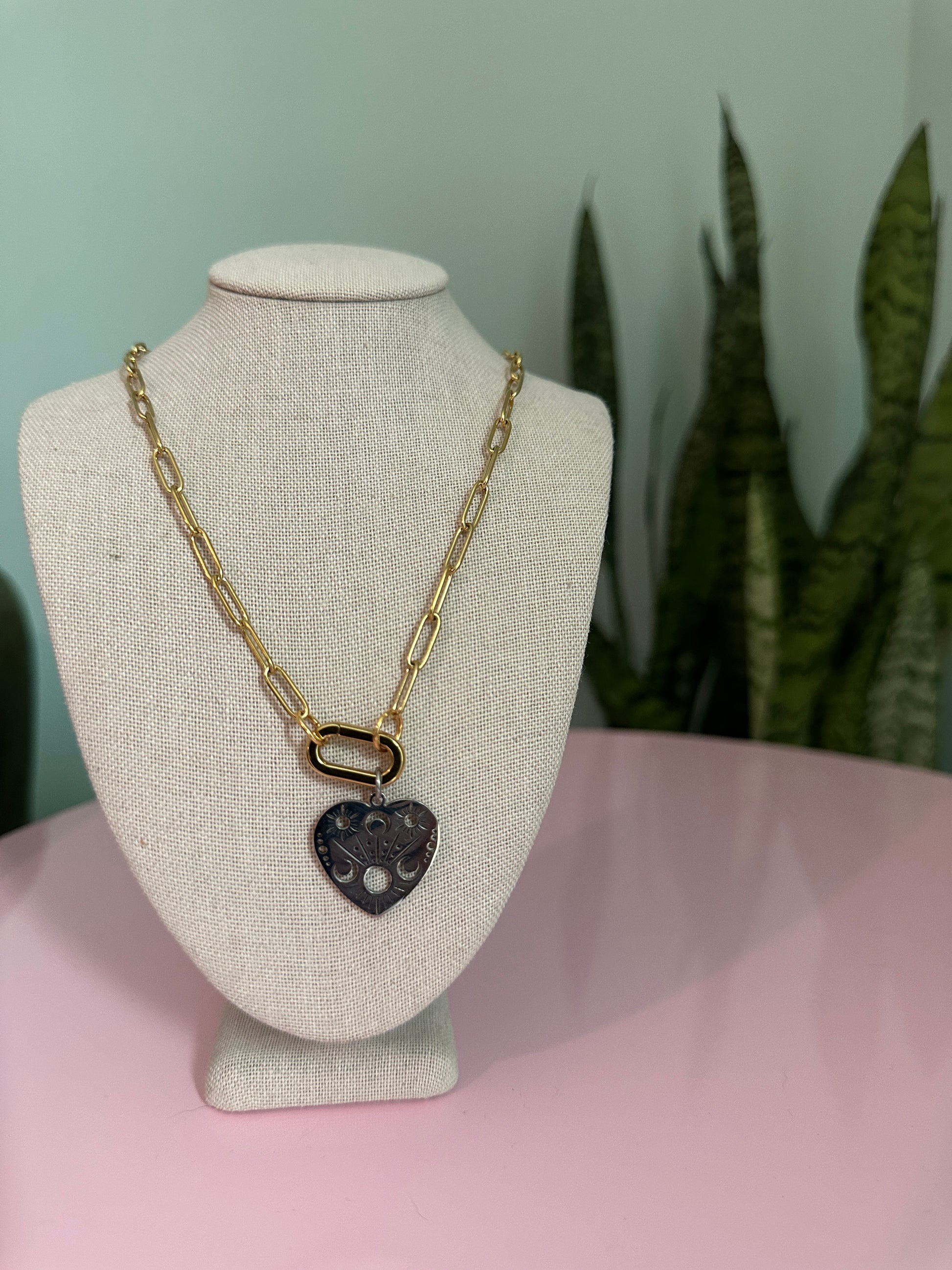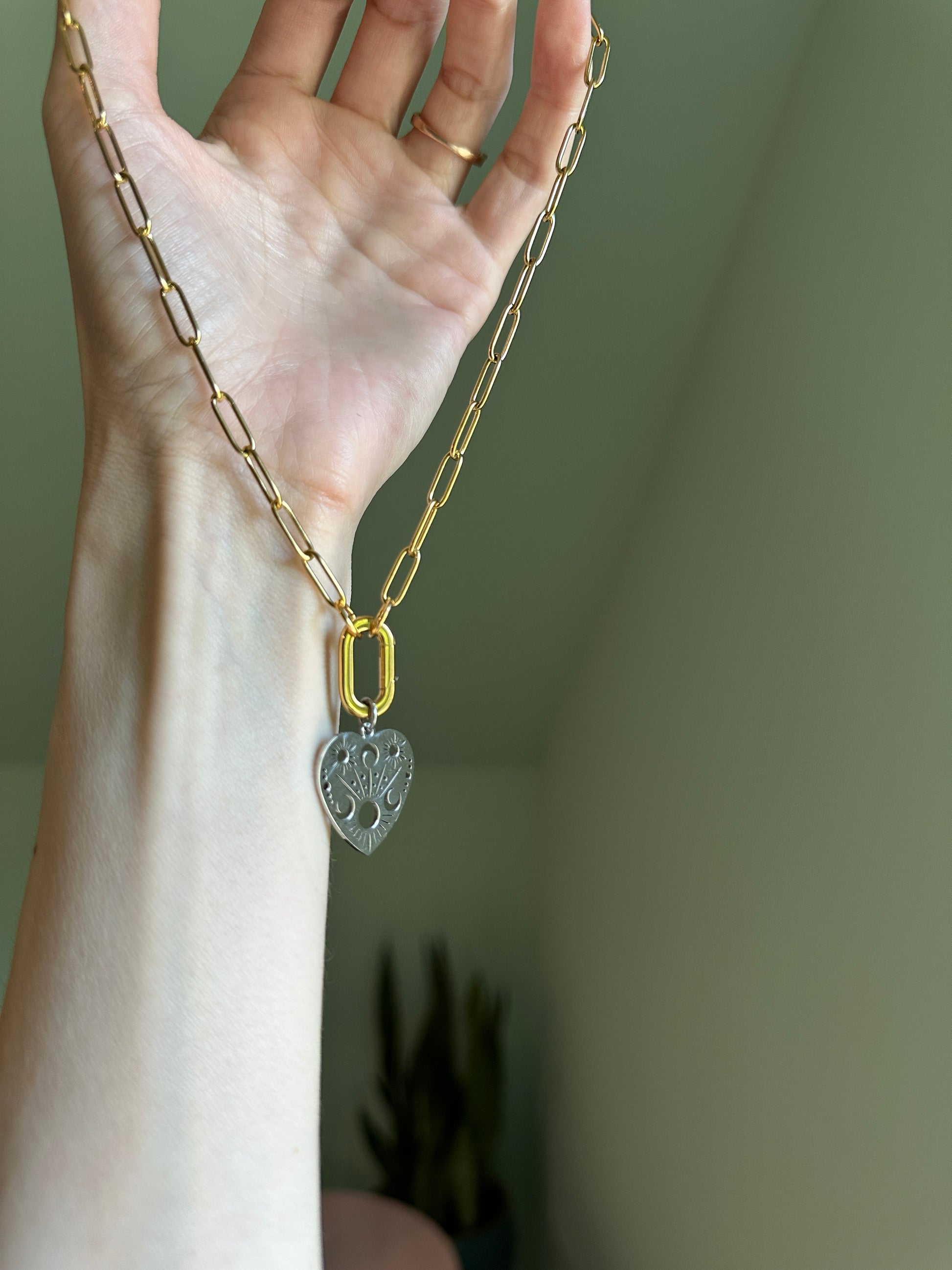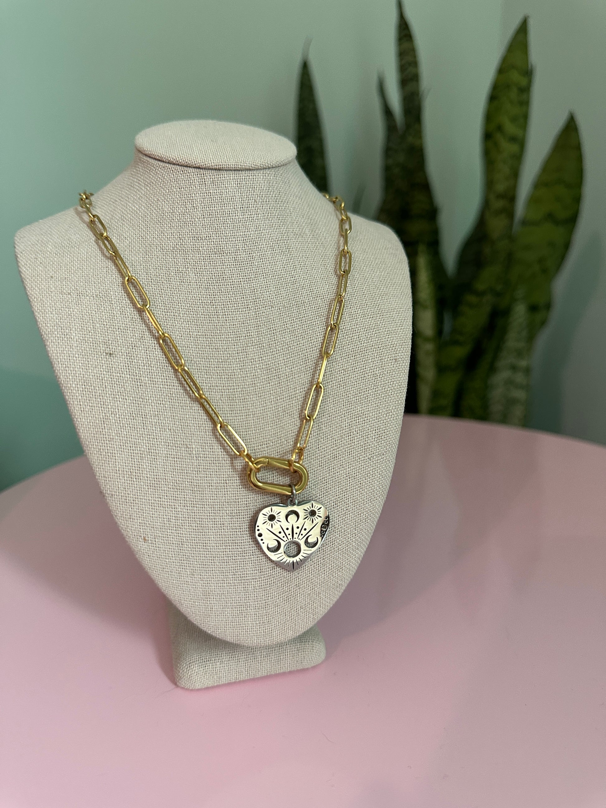 A little bit edgy, a little bit celestial — this mixed metal beauty is ready to shine in your stack. Featuring a gold-plated stainless steel paperclip chain and matching gold-plated carabiner clasp, this necklace is both bold and functional. The stainless steel heart charm is etched with sun, moon, and star details, making it a cosmic statement piece on its own. The best part? The carabiner opens, so you can switch up the look with your own charms or keep it simple and sleek.