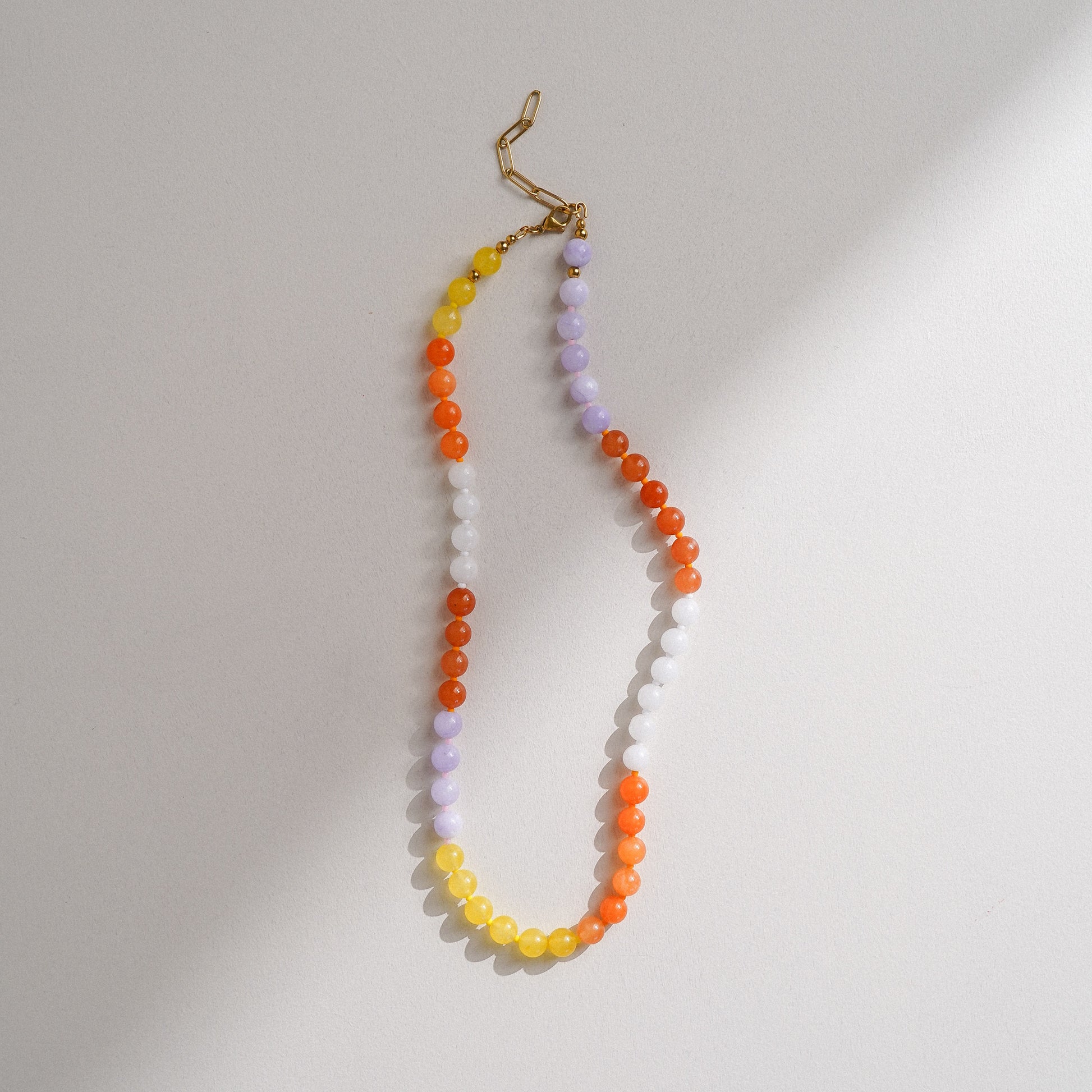 All the energy of a summer afternoon, worn around your neck! This necklace features dyed jade beads in a bold color block pattern — orange, yellow, white, and lavender — that somehow feels both retro and completely right now!