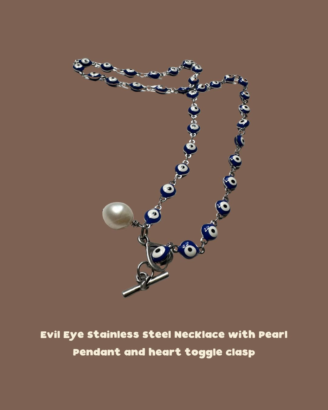 Enamel evil eye link stainless steel chain (10mm) has a bold, bohemian look. The Evil Eye dates back at least 5,000 years to the ancient Mediterranean. The symbol is believed to ward off misfortune or cast evil projections back to evil-doers. Stainless steel is durable, tarnish resistant, and hypoallergenic. Links are soldered shut for extra strength. Finished with an antique silver heart toggle clasp and pearl pendant that can be worn in-front or back! 18in long