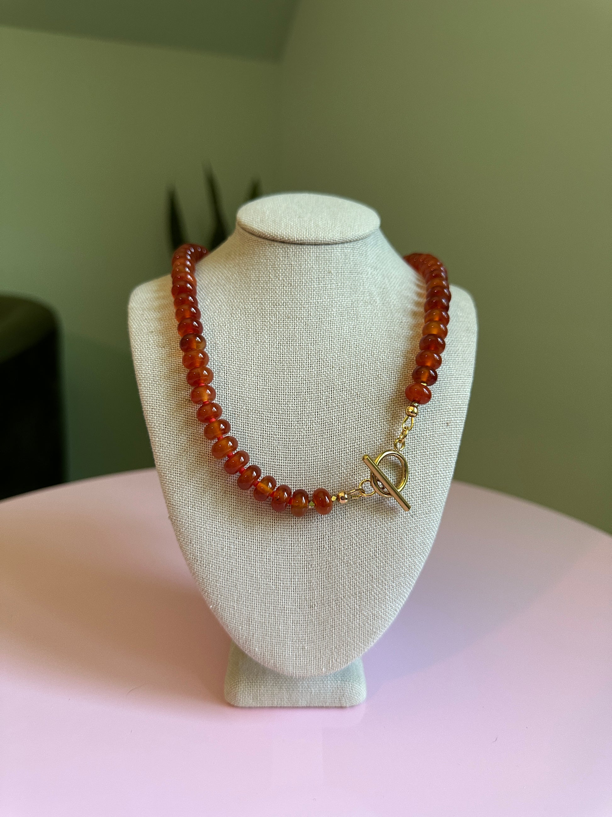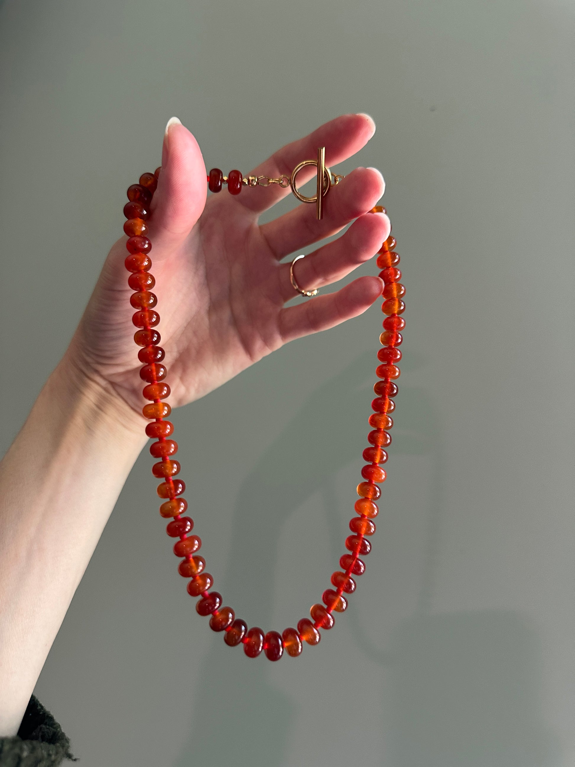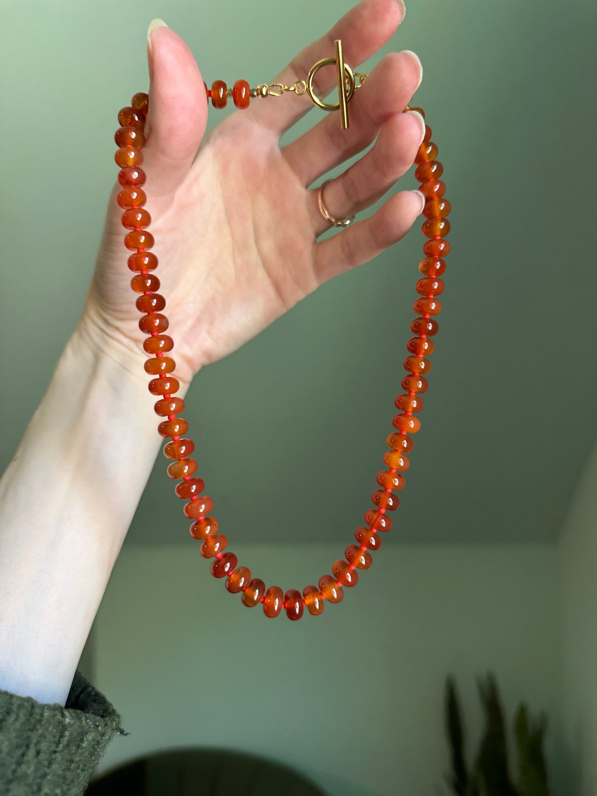 This necklace is strung with genuine 8mm carnelian rondelle beads in glowing shades of deep orange and ember red, for a piece that radiates warmth and energy! Carnelian is known as a stone of vitality and courage, and this strand carries that bold spirit beautifully. Finished with a sleek gold-plated stainless steel toggle clasp.