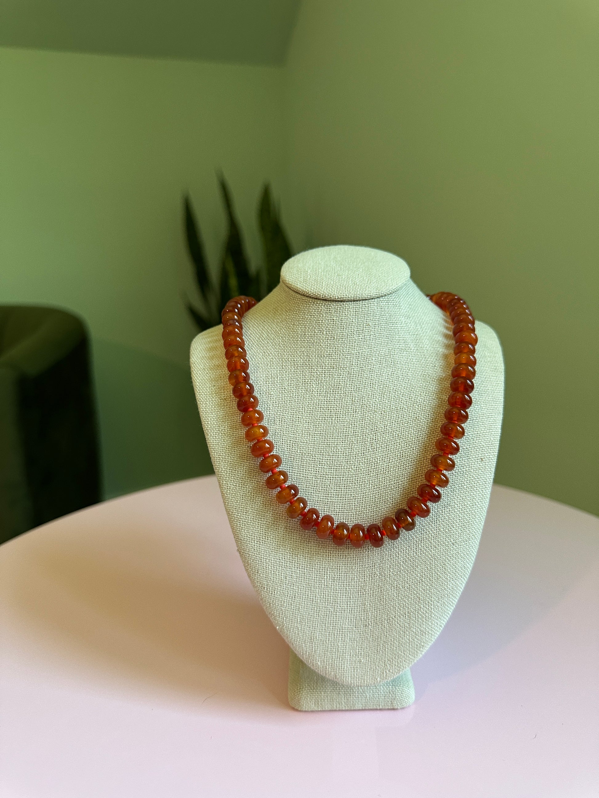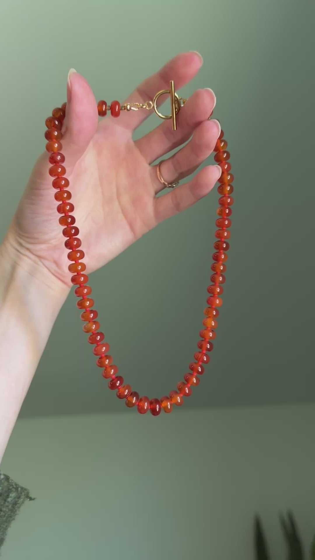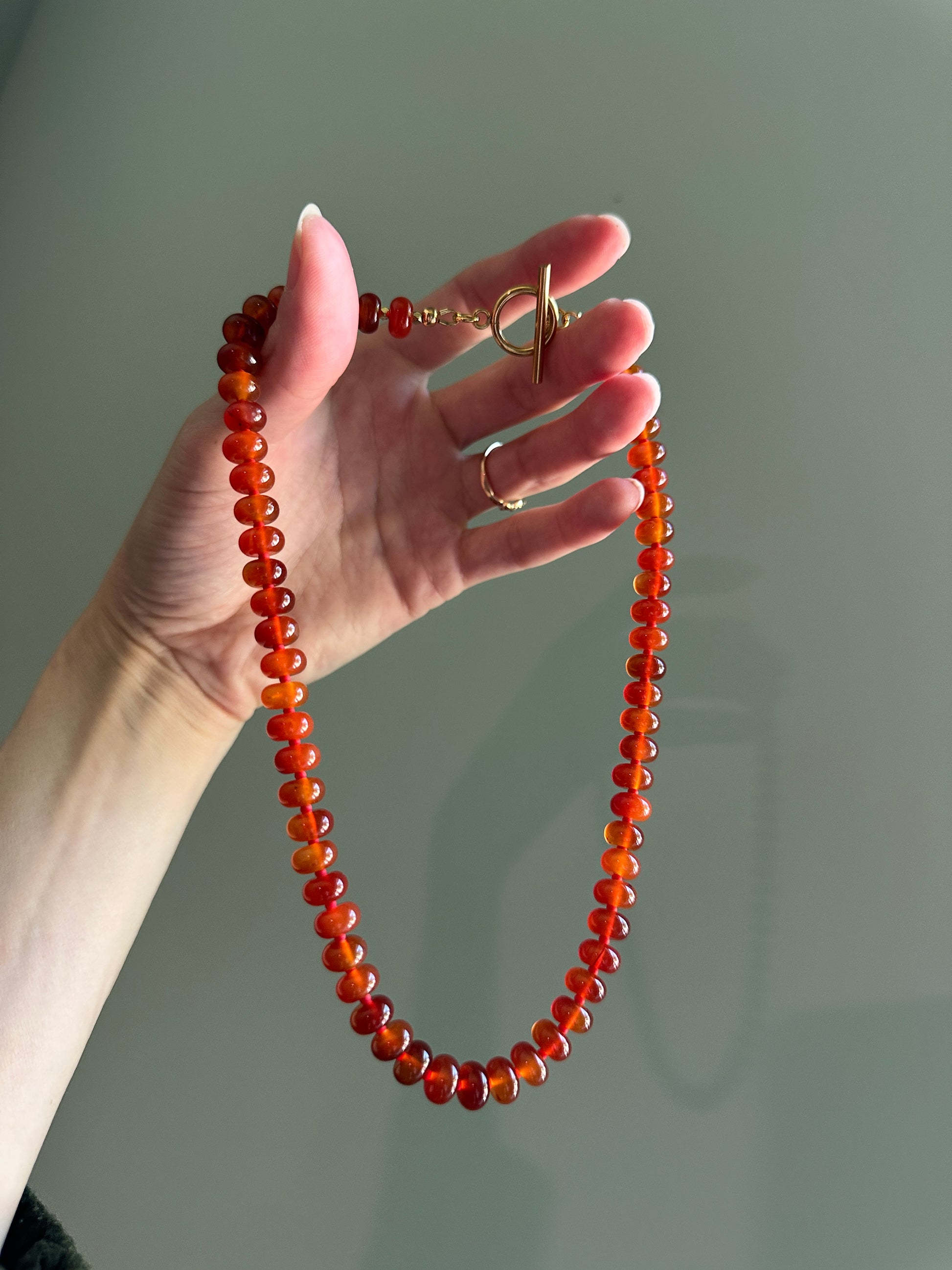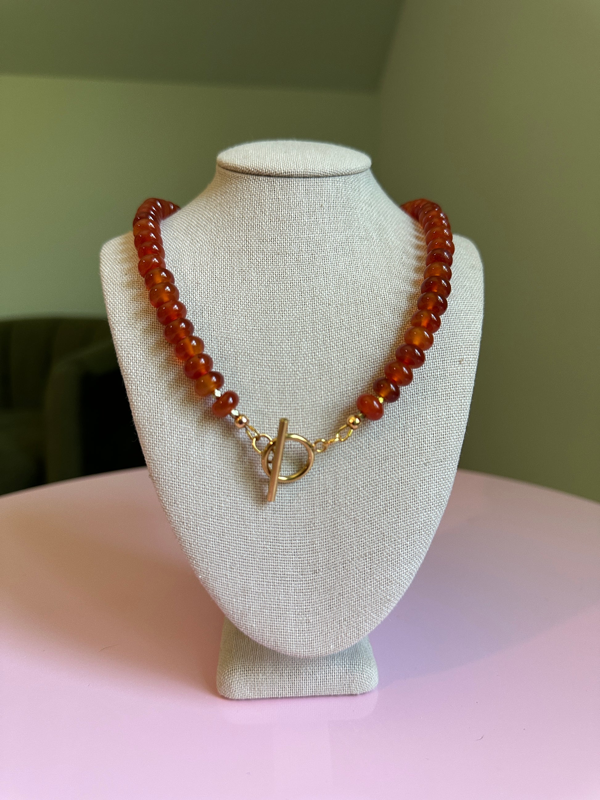 This necklace is strung with genuine 8mm carnelian rondelle beads in glowing shades of deep orange and ember red, for a piece that radiates warmth and energy! Carnelian is known as a stone of vitality and courage, and this strand carries that bold spirit beautifully. Finished with a sleek gold-plated stainless steel toggle clasp.