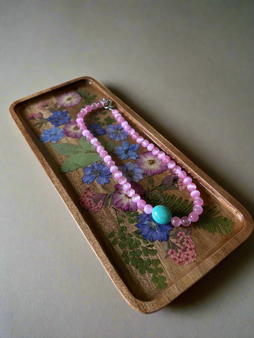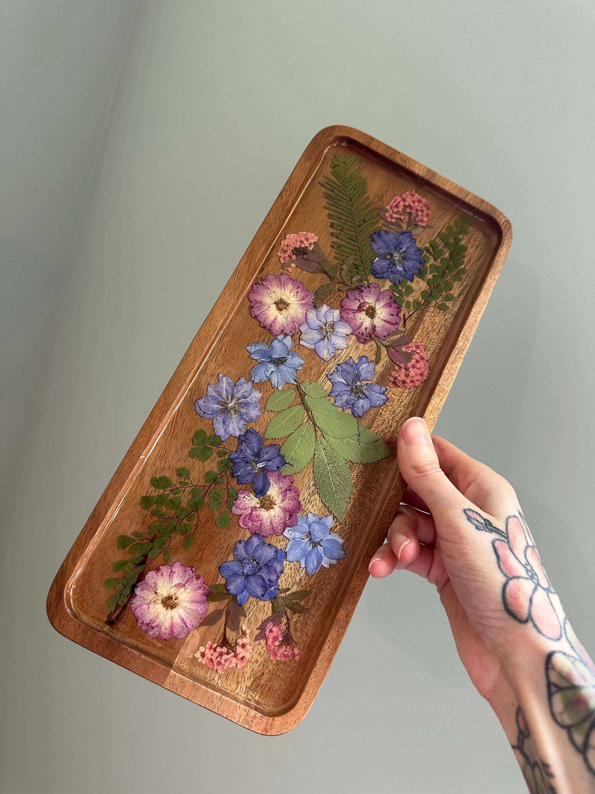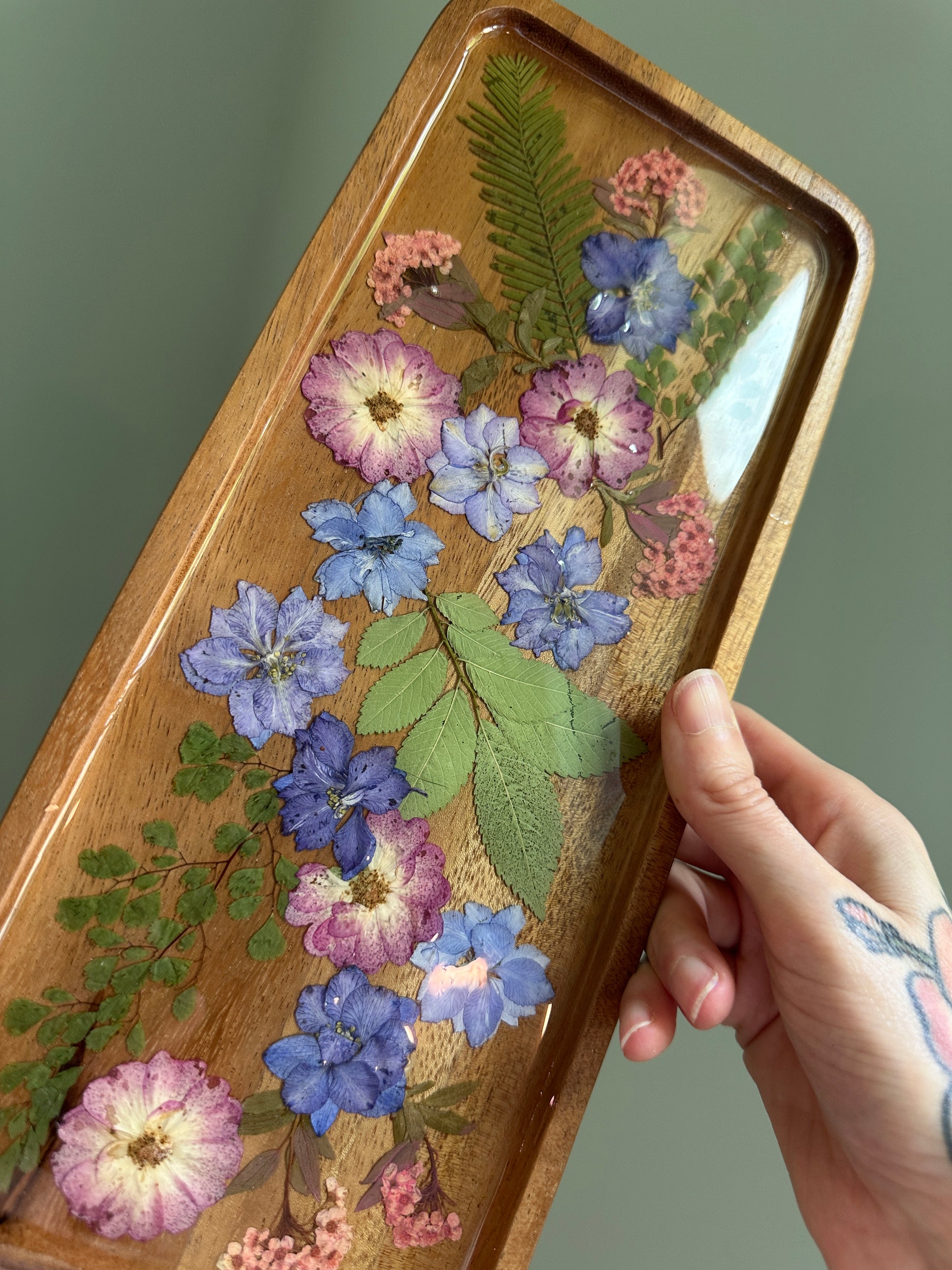 Made with real, pressed flowers on an olive wood tray.