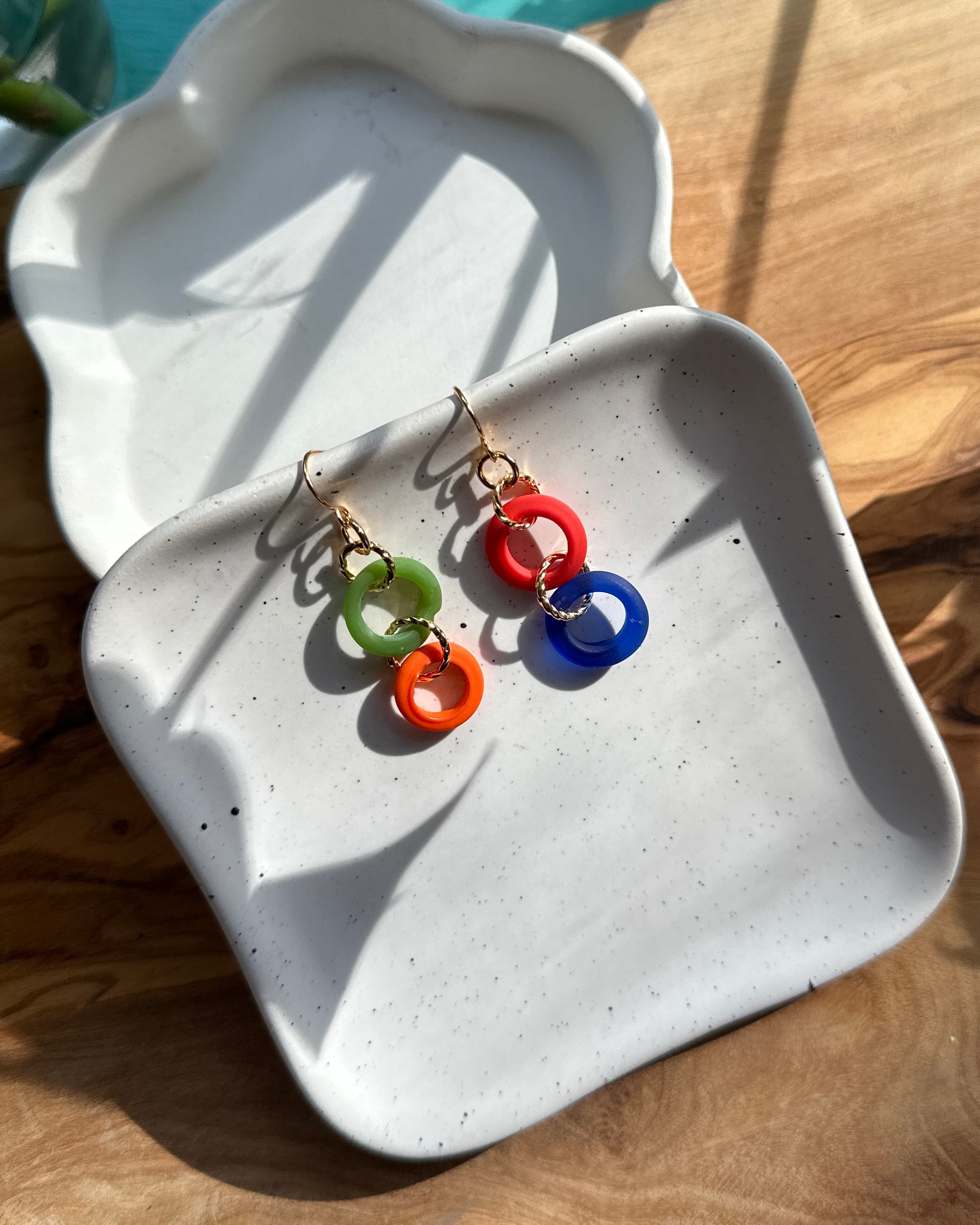 Green, Orange, Red and Blue! Recycled glass rings with gold plated stainless steel fish hooks.