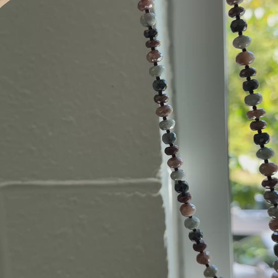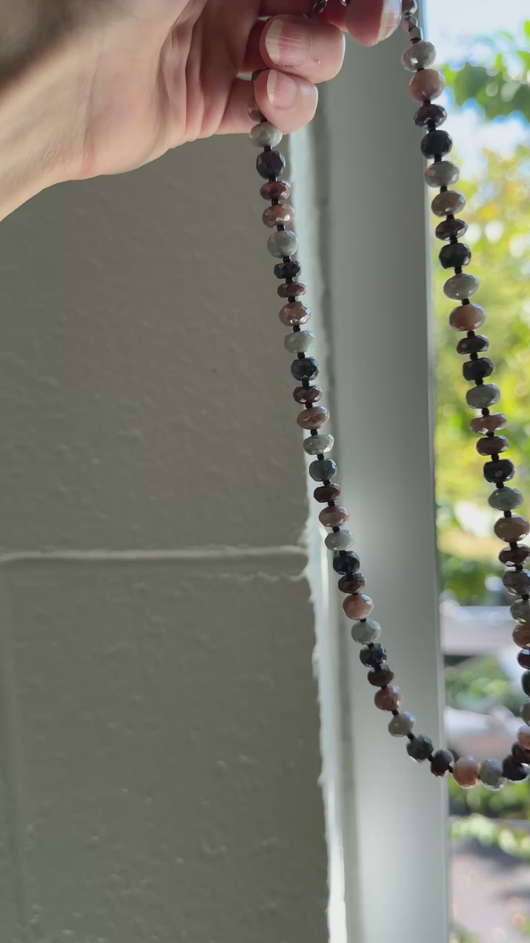This dreamy strand of multi-color moonstones captures the quiet magic of the night sky. Each faceted bead shimmers with its own flash, from deep stormy blue to soft mauve and creamy moonlight white, creating a natural gradient that feels both ethereal and grounded.