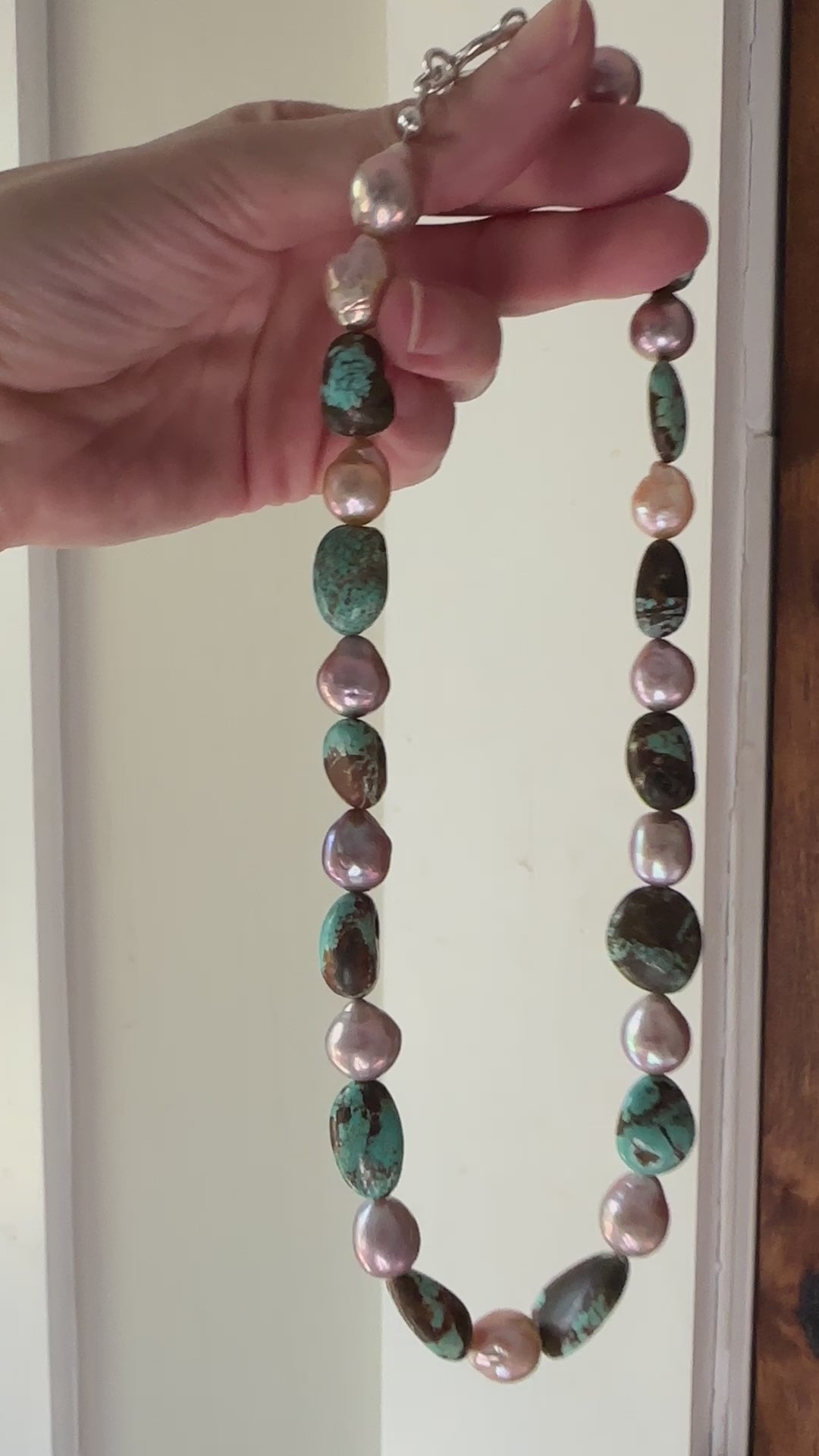 Oh baby! This one is hard to let go. Made with polished number 8 turquoise beads paired with gorgeous shimmery Edison pearls and a sterling silver toggle clasp.