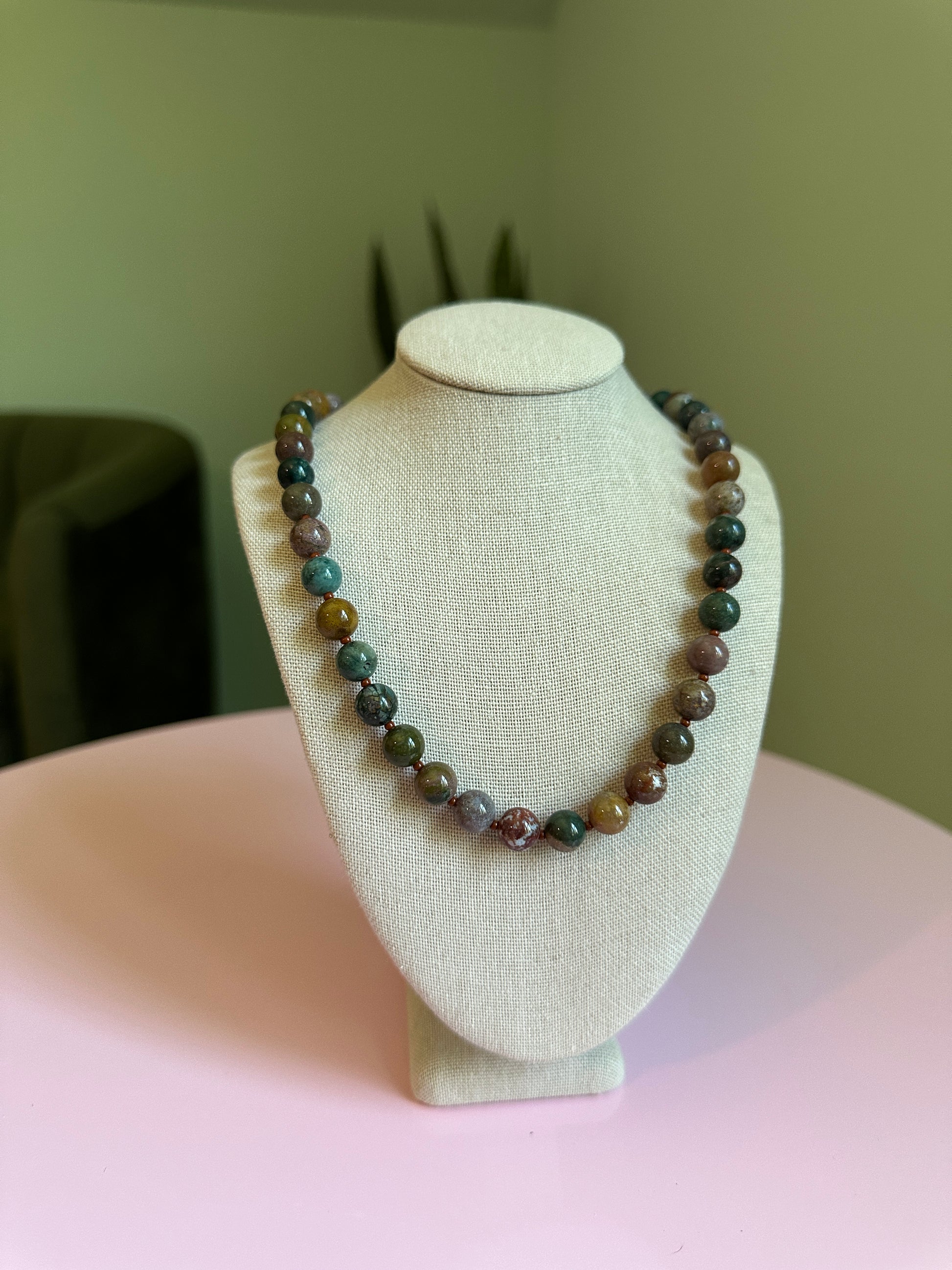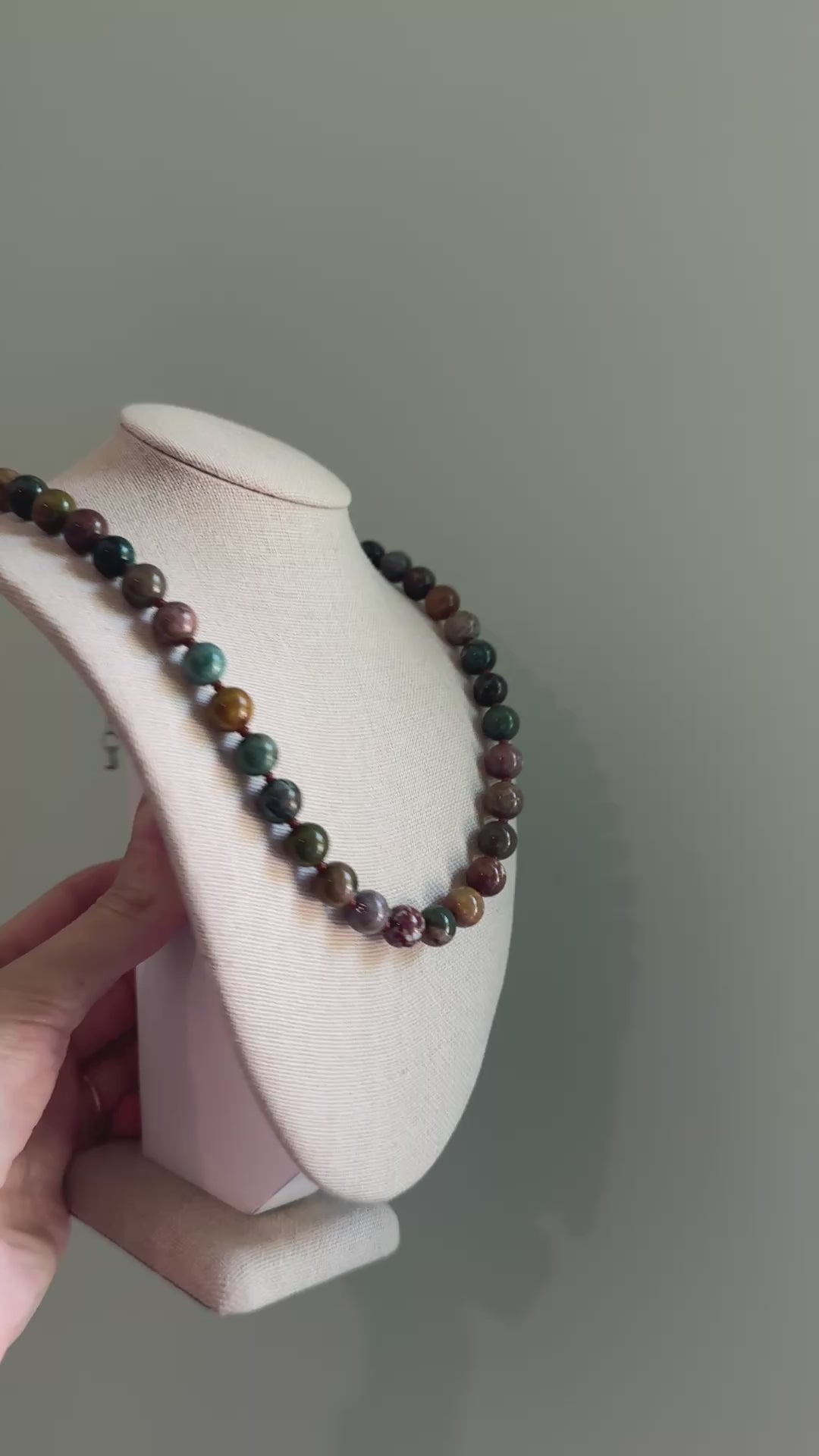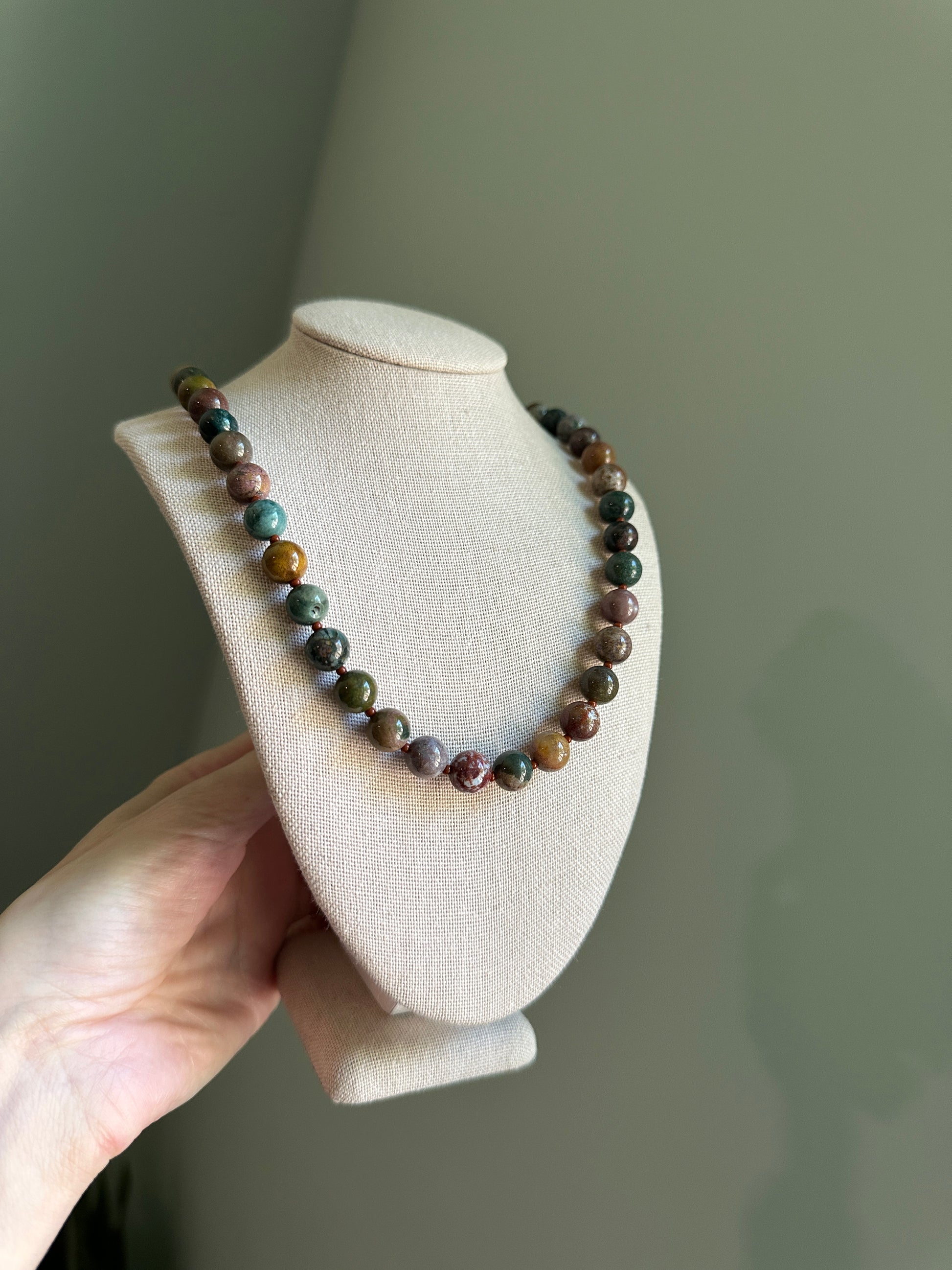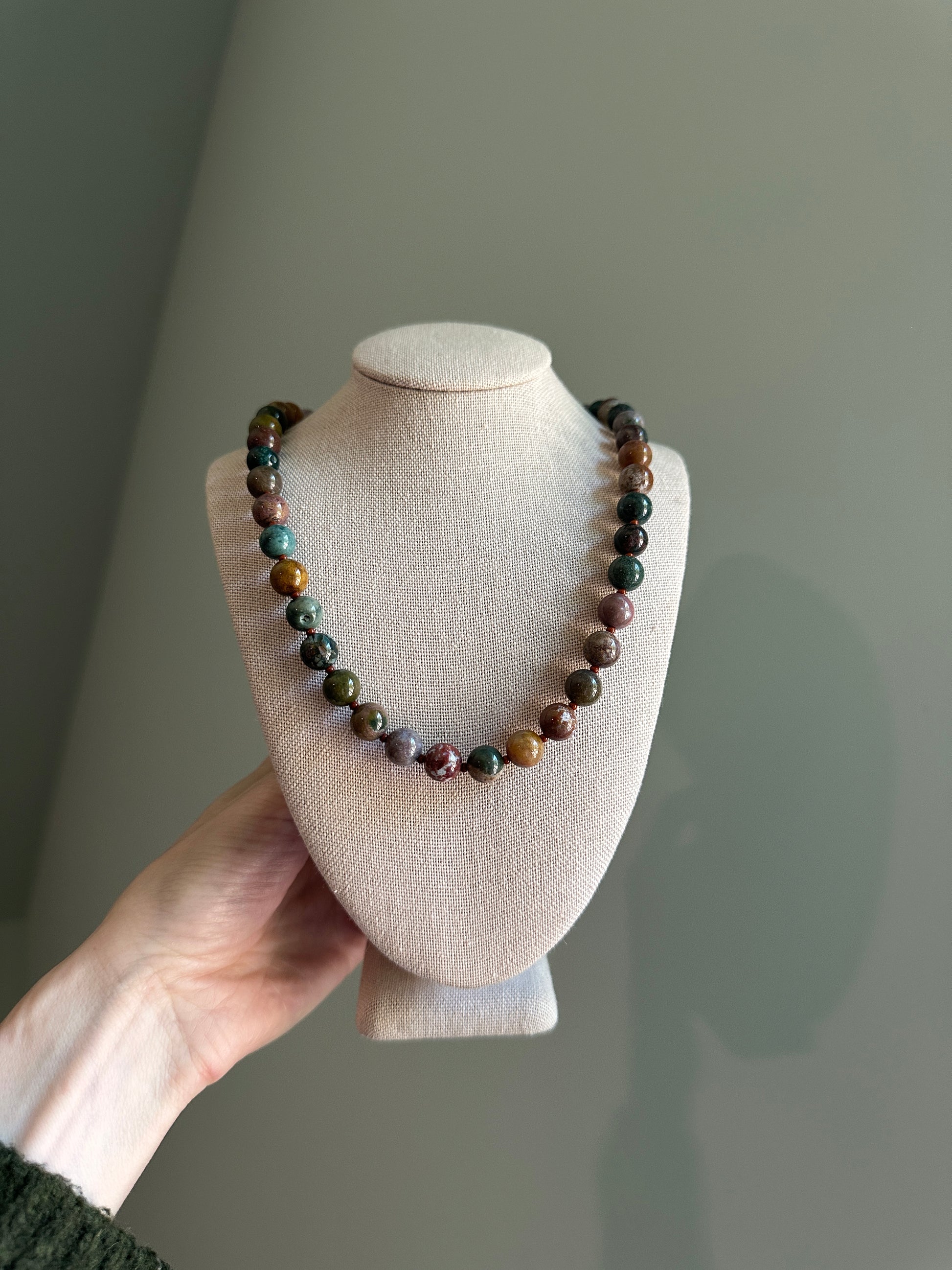 Bring earthy elegance into your jewelry collection with this one-of-a-kind ocean jasper necklace! Each round bead showcases nature’s palette with swirls of mossy green, deep maroon, golden brown, and hints of teal. Known as the “stone of joy,” ocean jasper carries grounding and calming energies, making this necklace as meaningful as it is beautiful. Truly beautiful, rich colors perfect for fall!