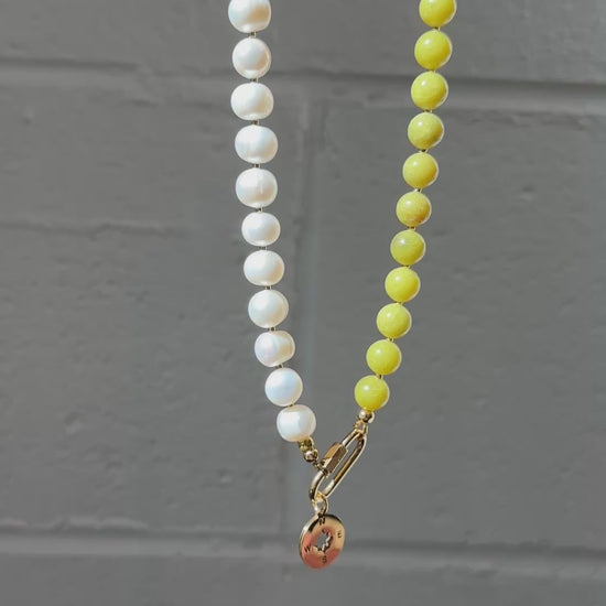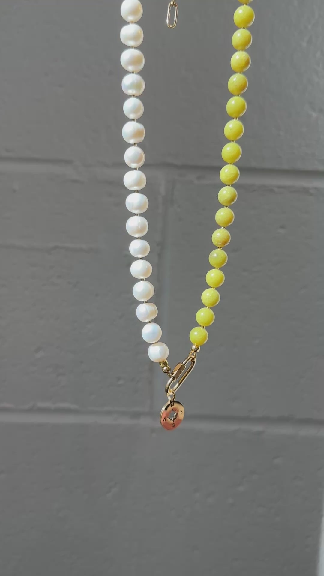 This half-and-half design blends elegance with a hint of adventure! One side features luminous freshwater pearls, while the other showcases smooth 8mm olive jade beads, symbolizing balance and renewal. At the center hangs a functional gold-plated stainless steel carabiner clasp with a dainty compass charm. The necklace measures 18 inches with a 2-inch extender for easy layering.