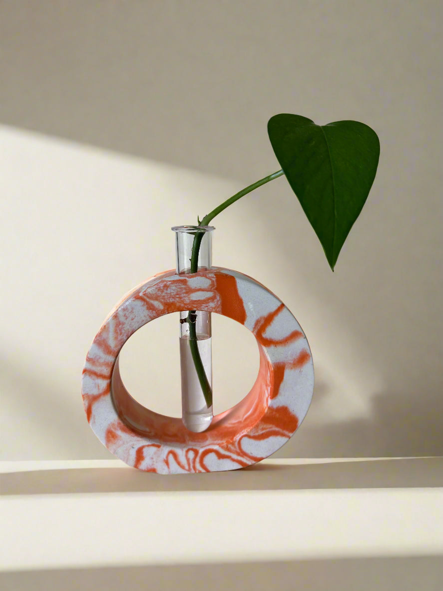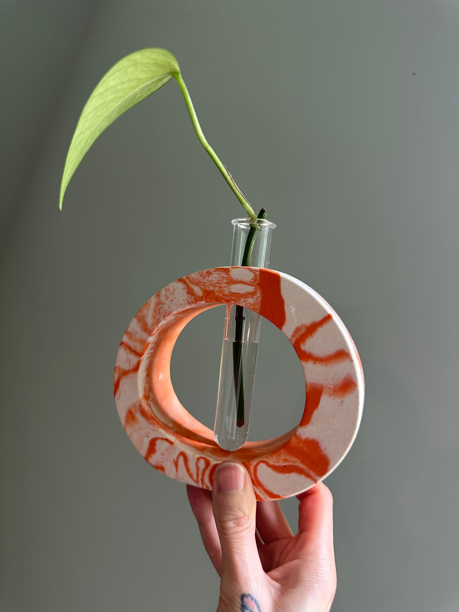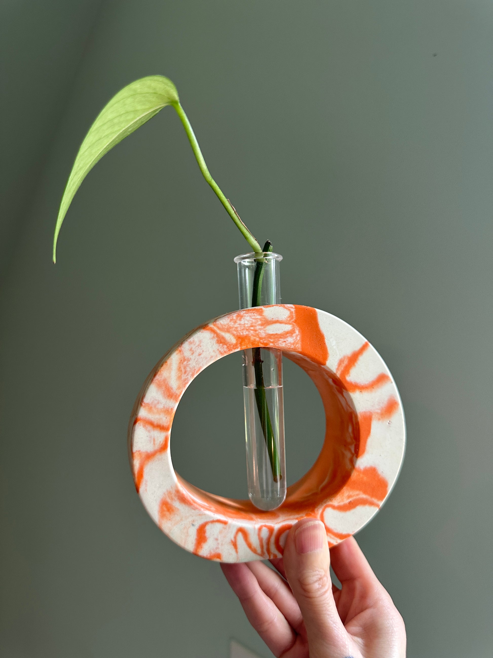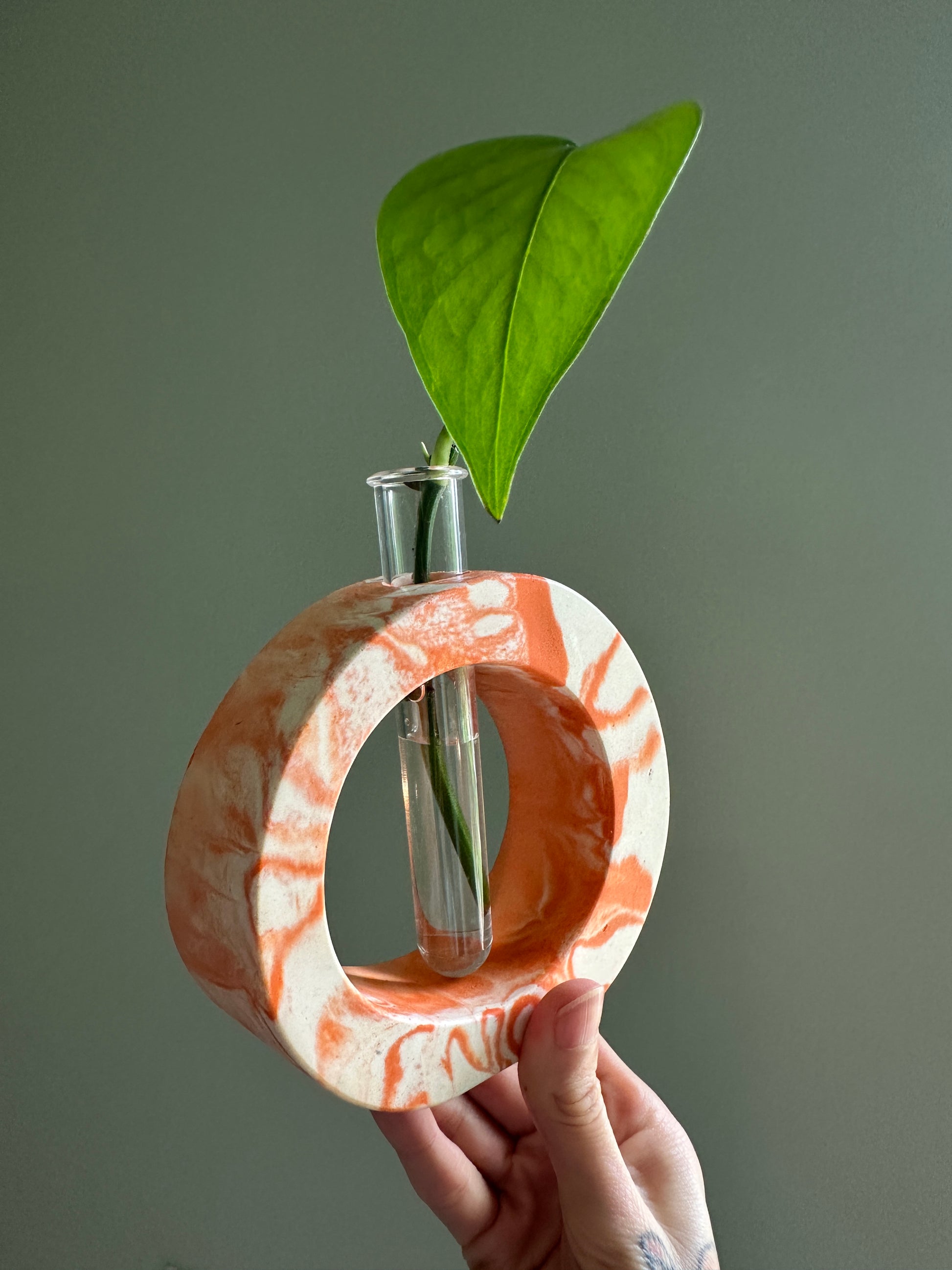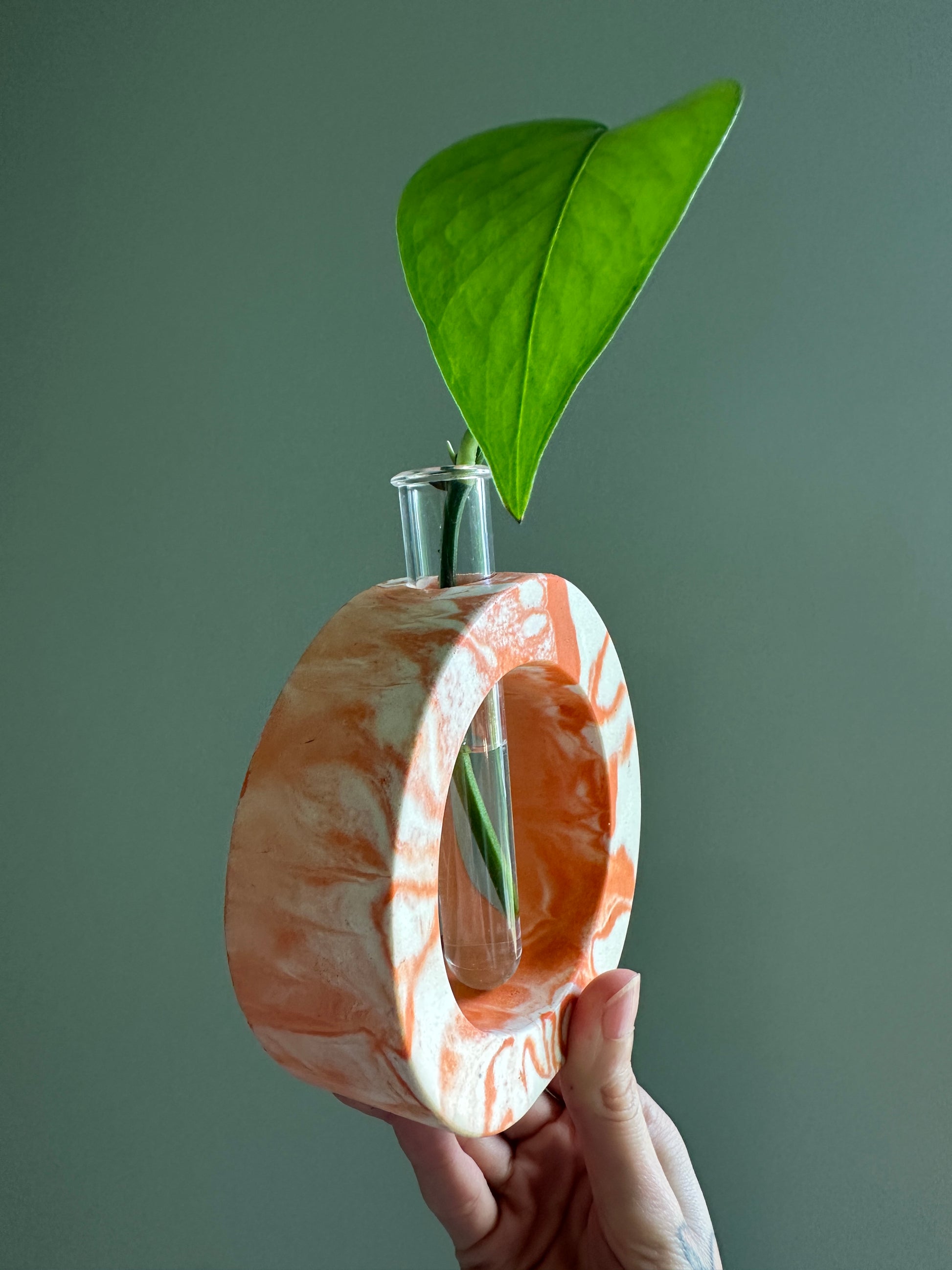 Orange and white swirly pattern for this beauty! Please note there is a noticeable difference between the front and back, so this would not make a good centerpiece but rather up against a wall.