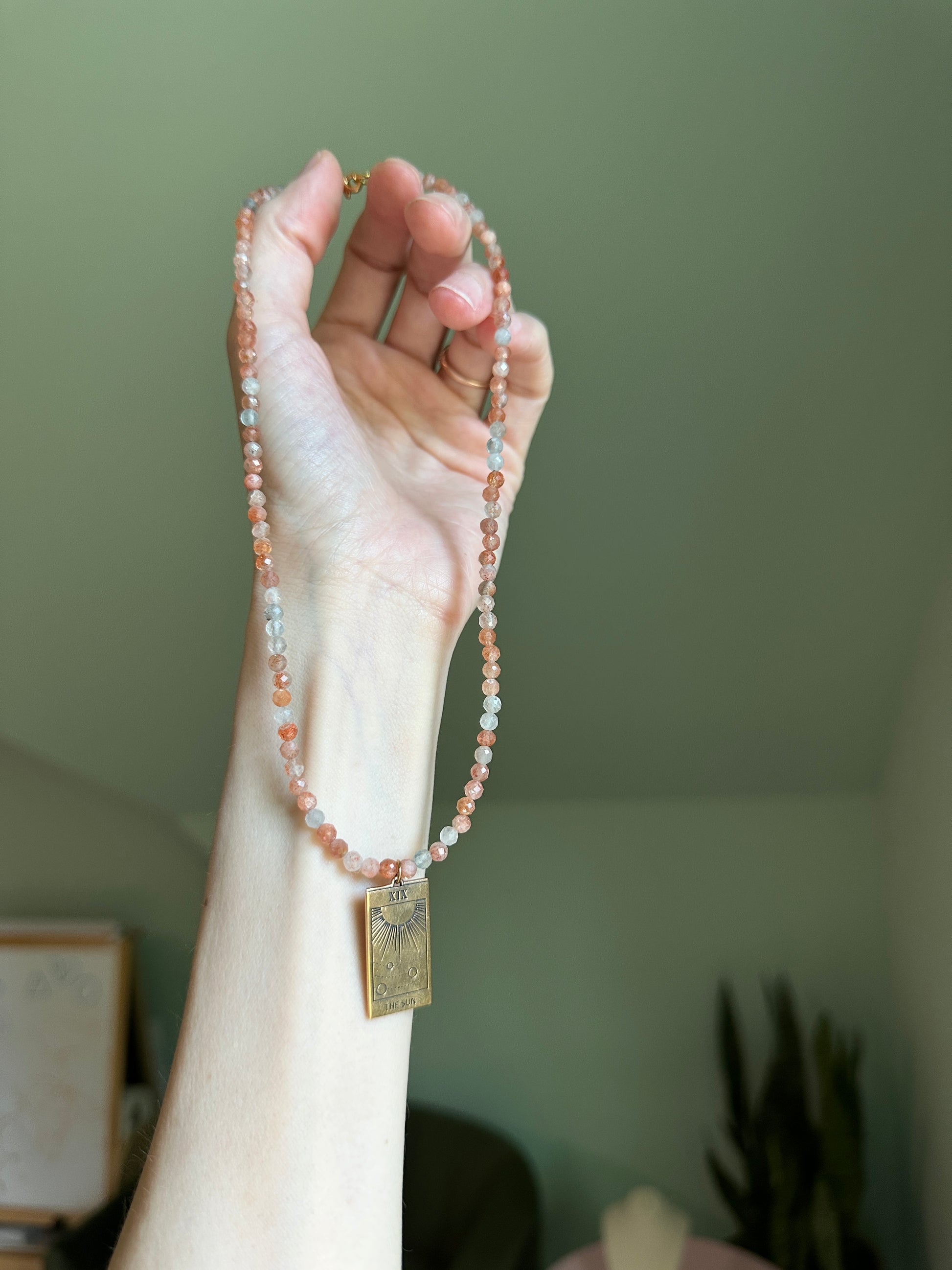 Capture the glint of sunlight with these tiny, sparkling Oregon sunstone semi-prescious beads. Their precise faceting catches the light, making them a subtle but brilliant addition to any outfit! The natural radiance of these gems pair beautifully with this sun card pendant. The Sun signifies abundance, radiance, vitality, success and happiness.