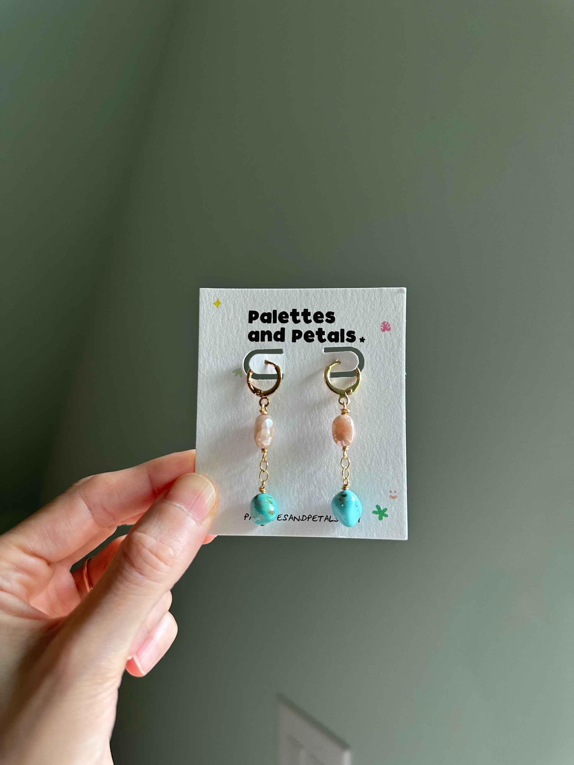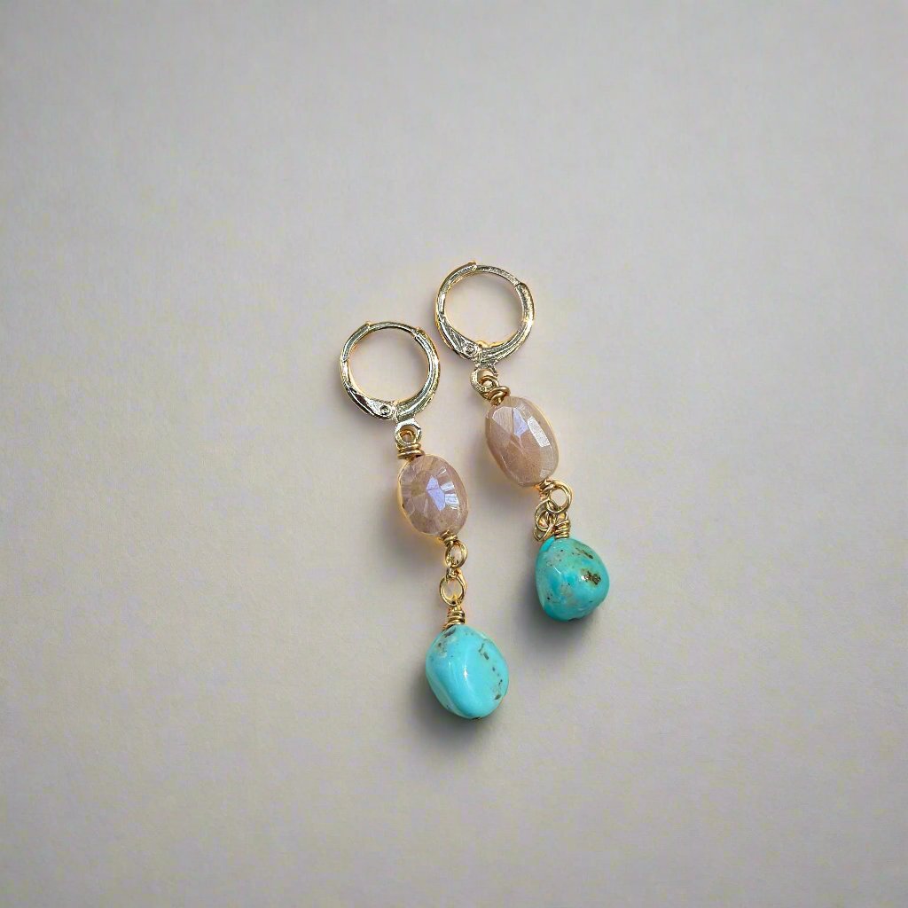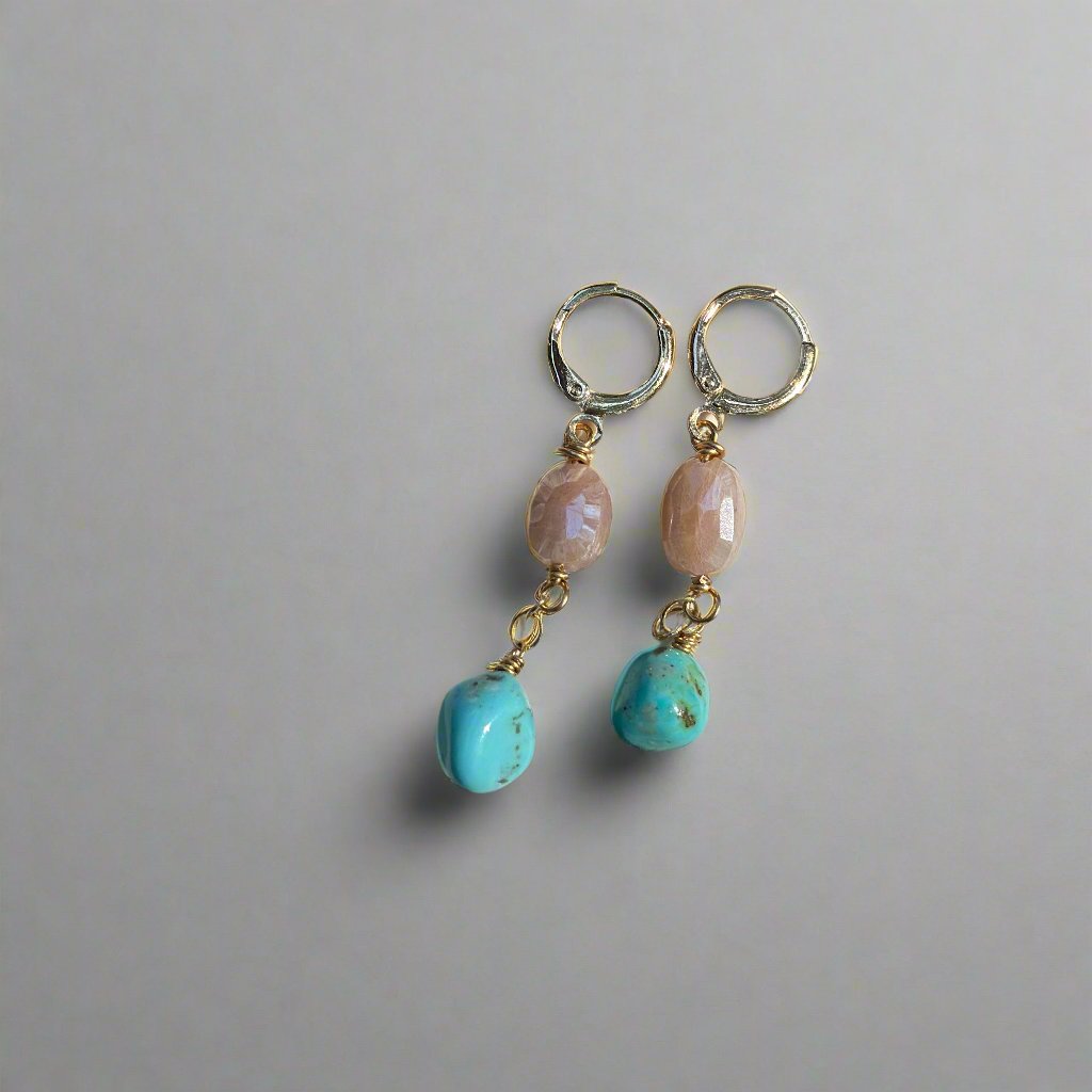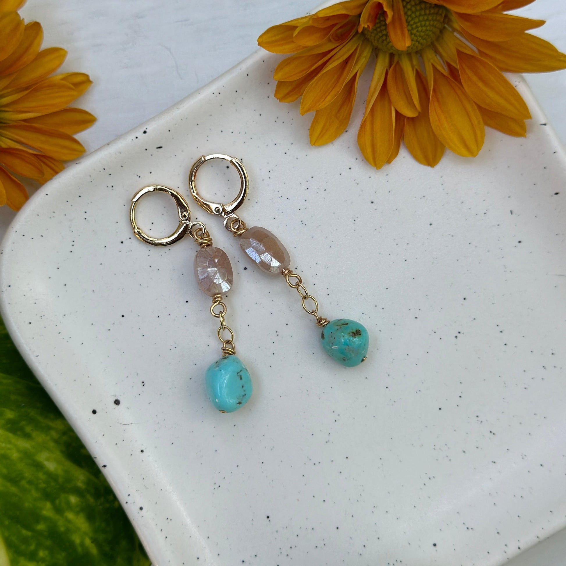 Peach Moonstone and Sonoran Turquoise Earrings - Gold Filled
