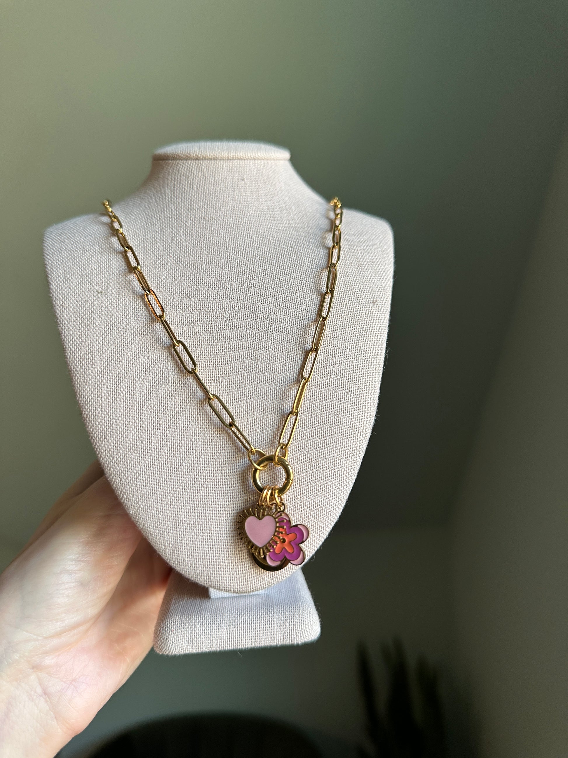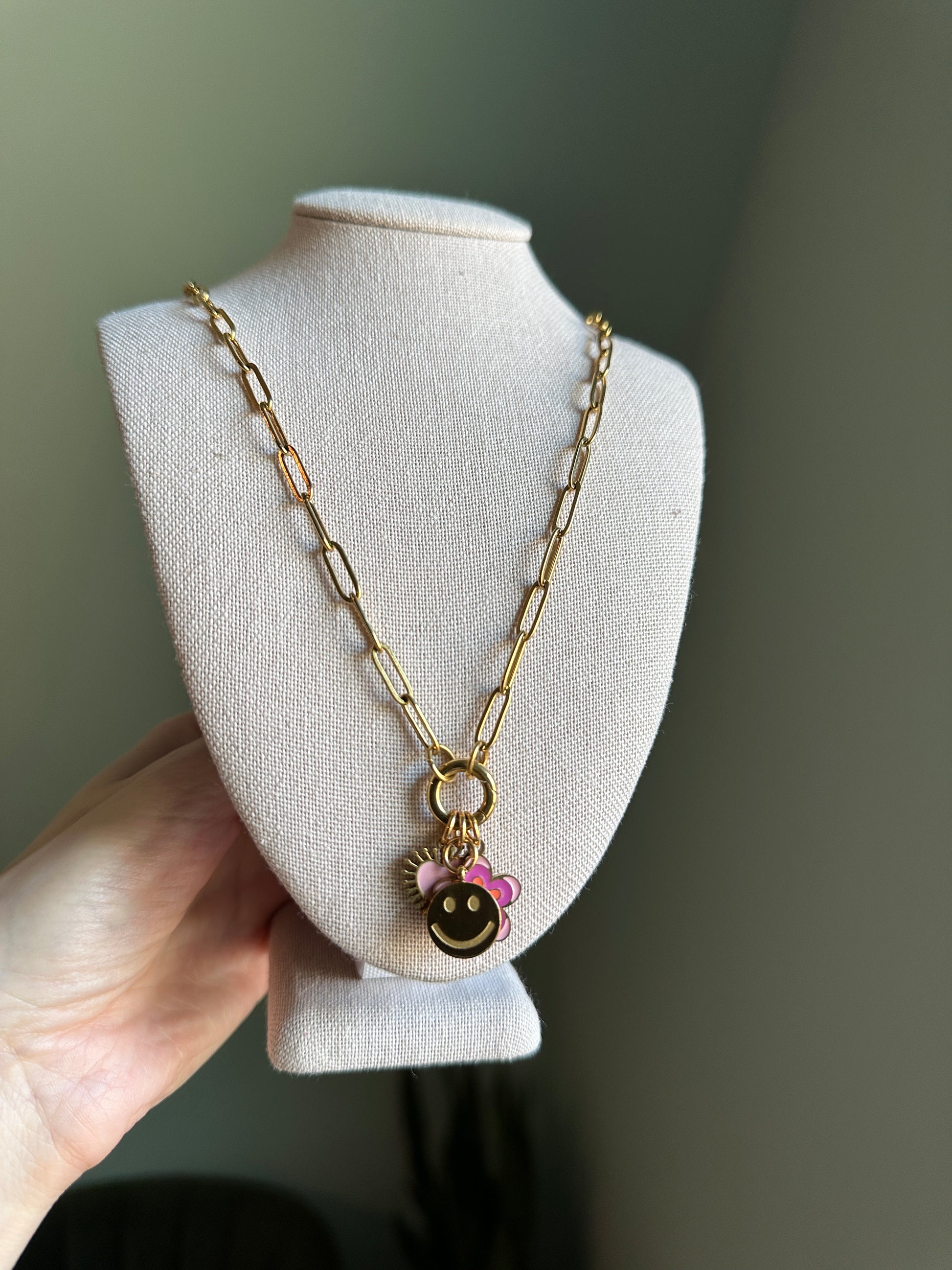 These PVD stainless steel charm keeper necklaces are sleek paperclip style chains with a front round carabiner clasp. Each necklace comes with three enamel charms (including a sweet pink heart, happy face, and flower) that you can keep on, take off, and swap around whenever the mood strikes.