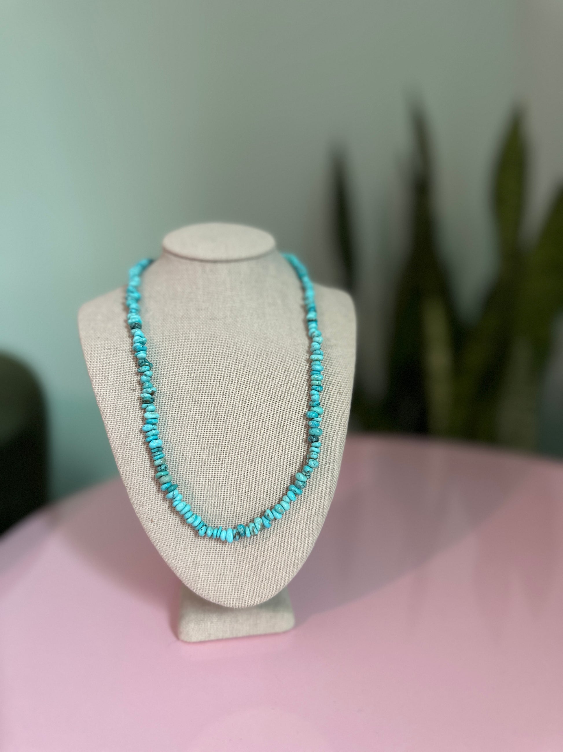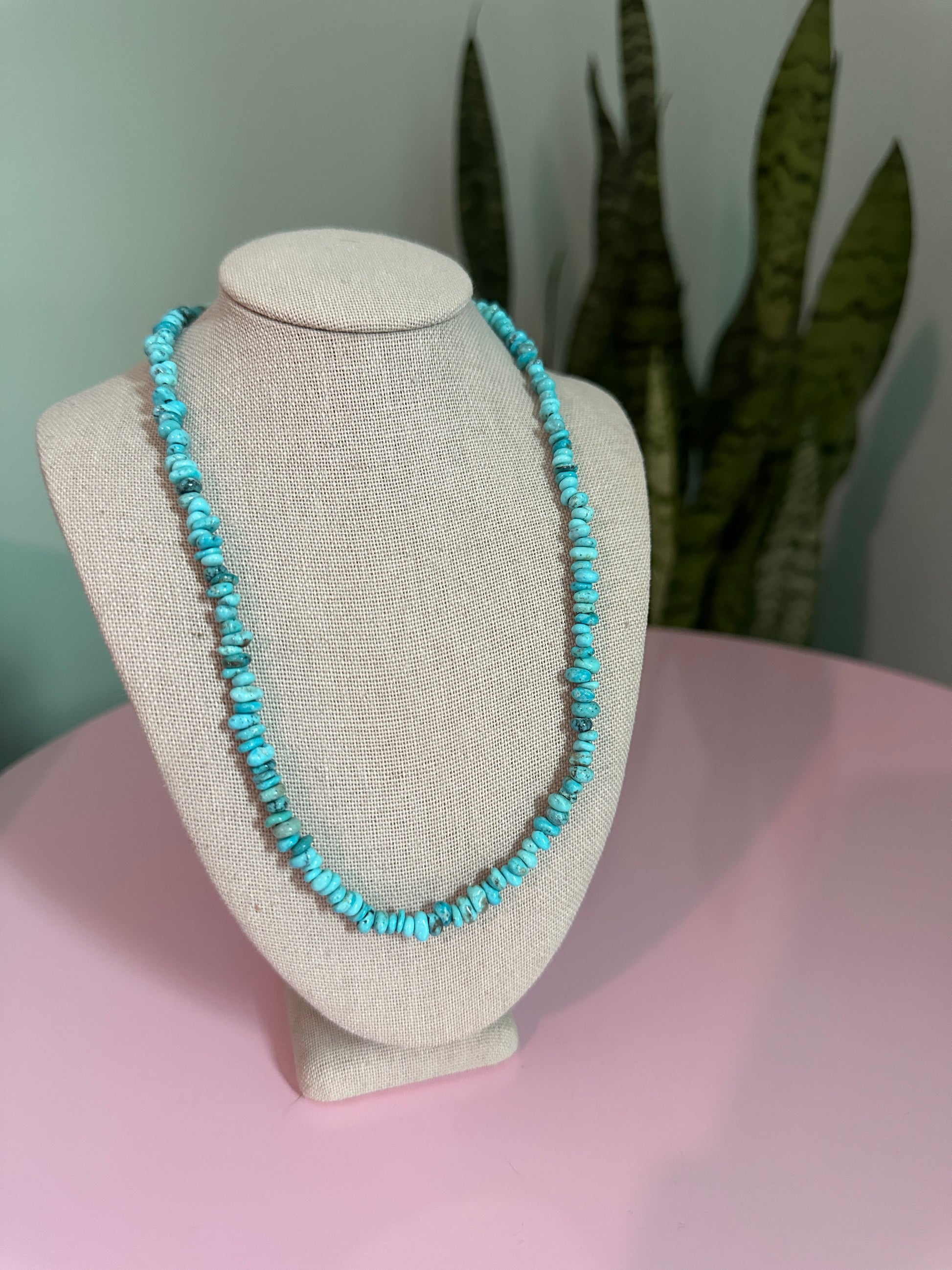 A petite treasure for turquoise lovers, this necklace is crafted with genuine Sonoran turquoise nugget beads, mined in Mexico. Each stone radiates a vivid sky-blue hue with natural matrix patterns, making every piece unique. The 16-inch strand sits at the collarbone and includes a 2-inch extender for adjustable length, finished with a durable stainless steel lobster clasp. Lightweight, versatile, and perfect for layering or wearing solo, it’s an easy way to add a pop of authentic turquoise to your everyday style.