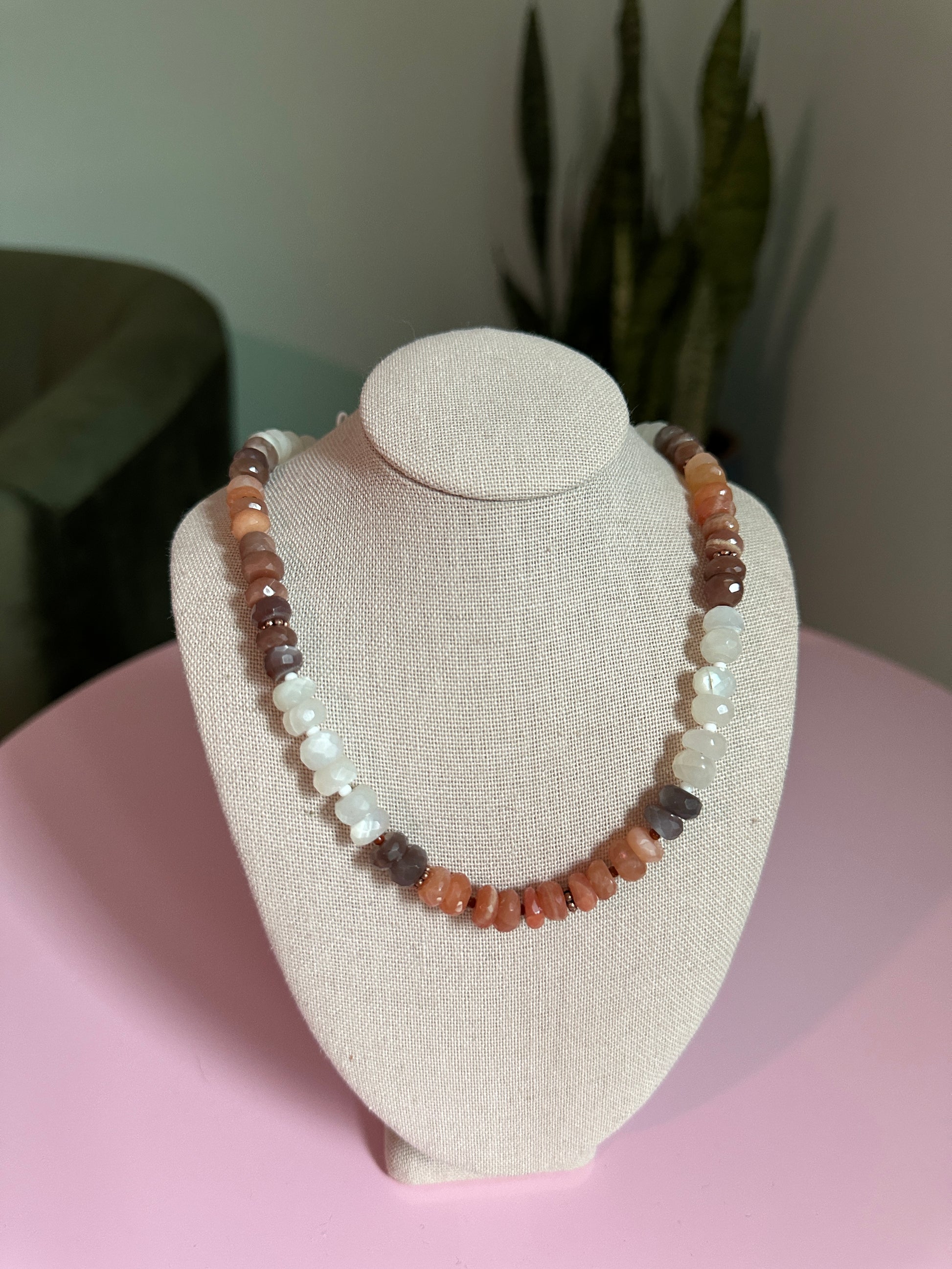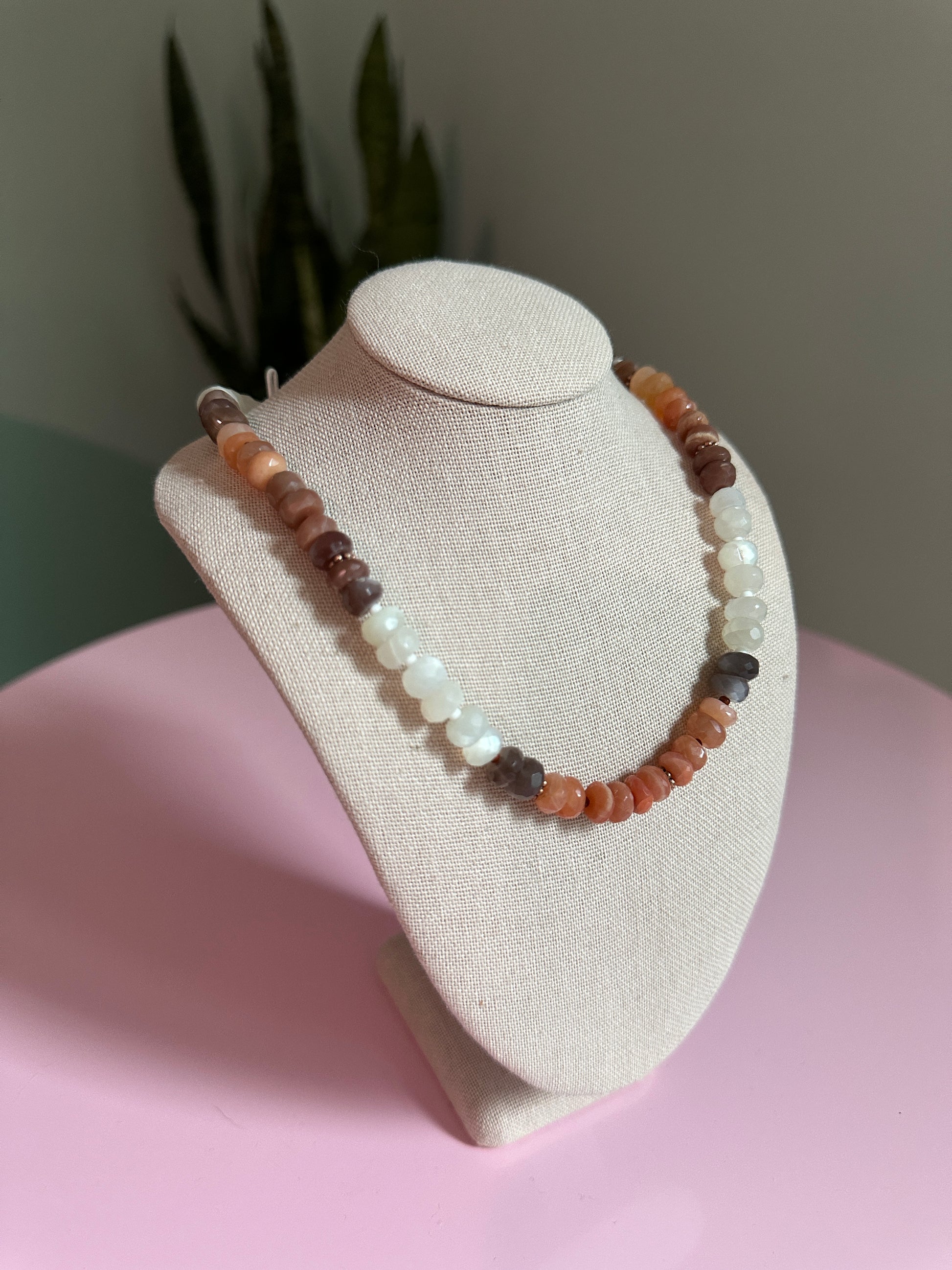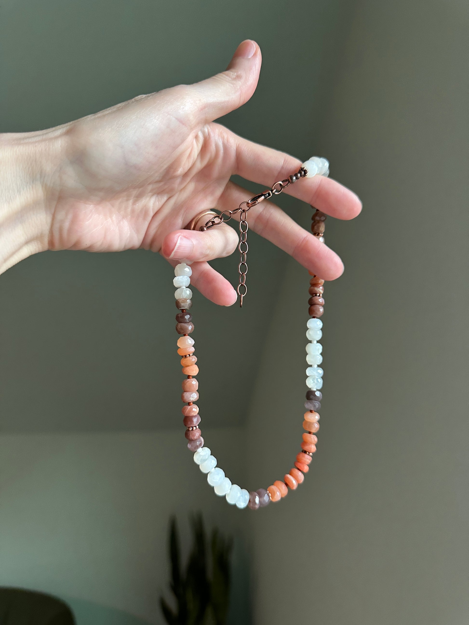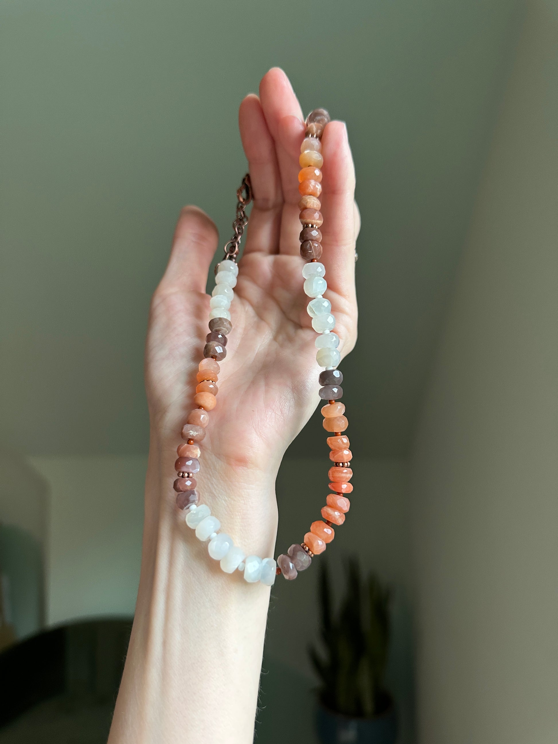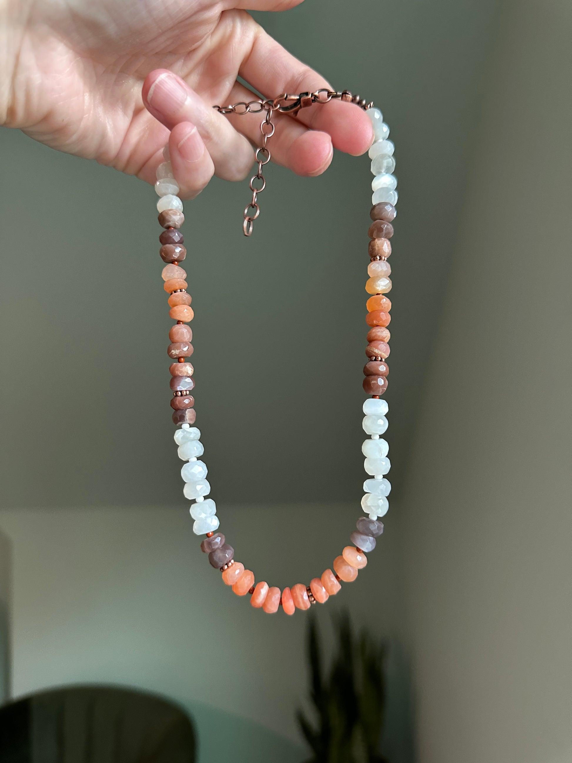 This dreamy choker features faceted rondelle moonstone beads in a warm, sunset-inspired palette — creamy white, golden peach, and earthy taupe — all hand-strung for an organic, one-of-a-kind feel. Each moonstone bead catches the light with a soft shimmer, adding a touch of magic to your every move. Finished with an antique copper lobster clasp and extender chain, this piece is as versatile as it is stunning, perfect for layering or wearing solo.
