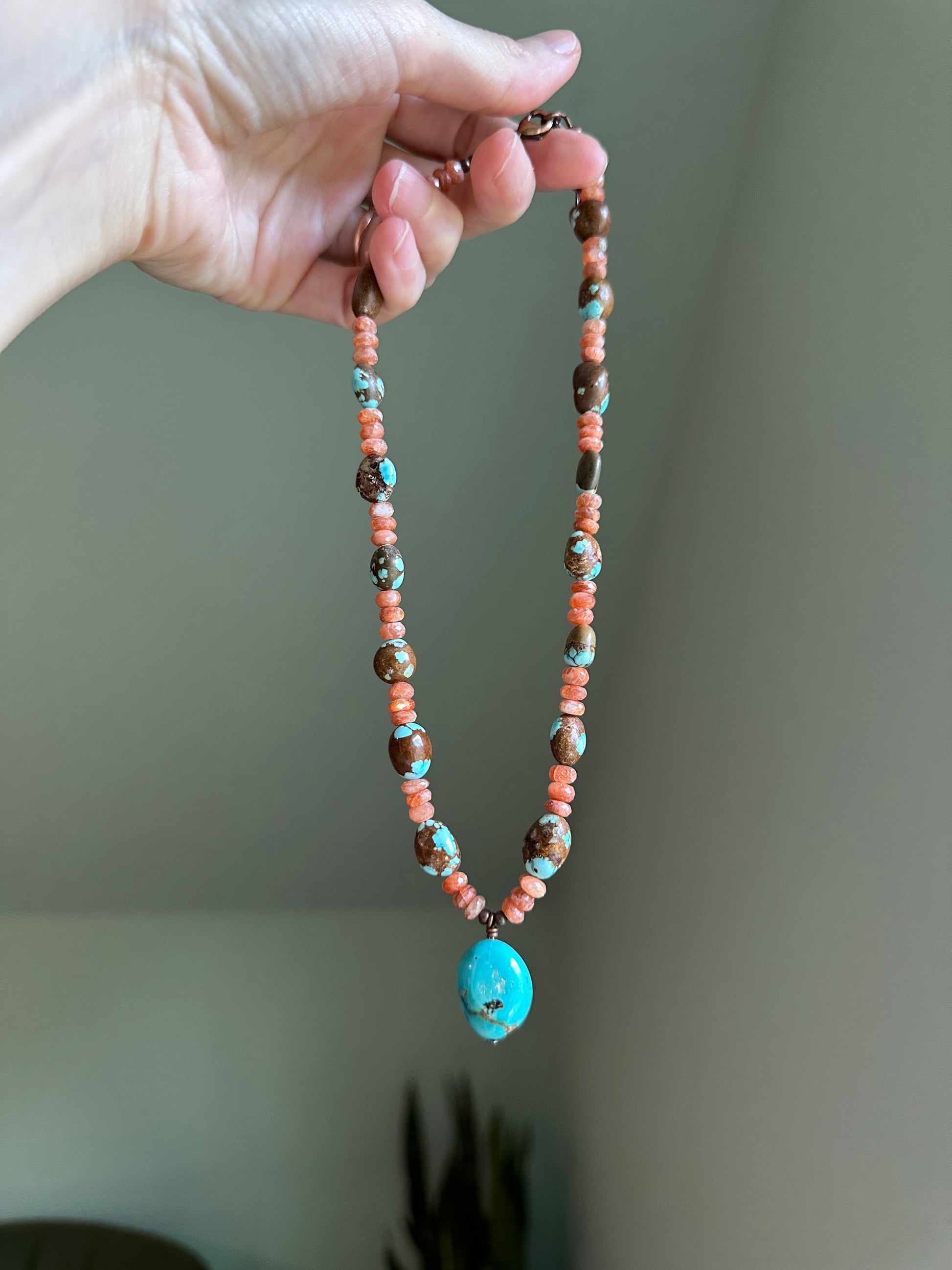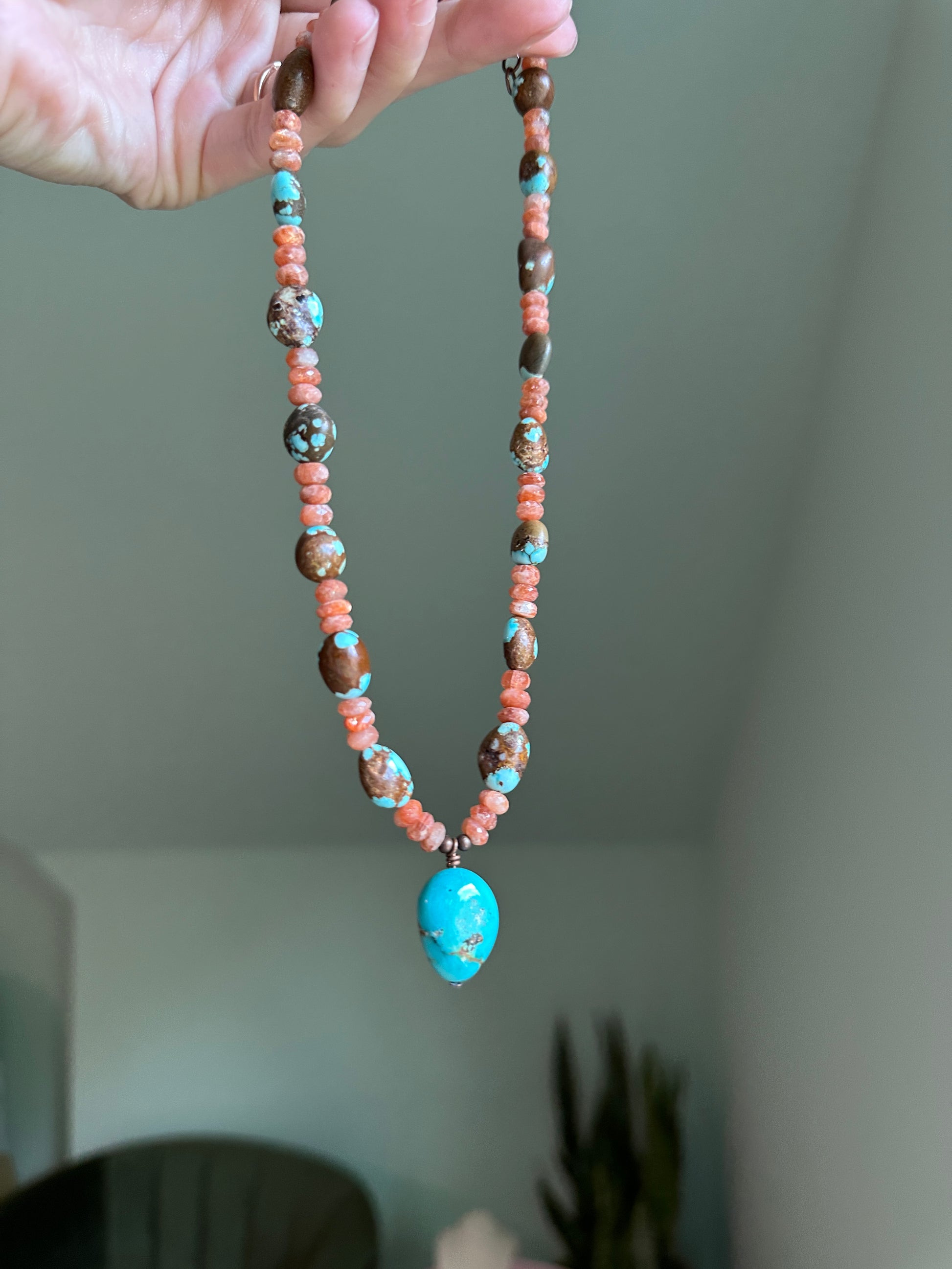 Crafted with vintage #8 turquoise beads, shimmery faceted sunstone beads, and a beautiful Kingman turquoise pendant, this necklace is a true statement piece! At 16 inches long with a one inch extender, it can be adjusted for the perfect fit.