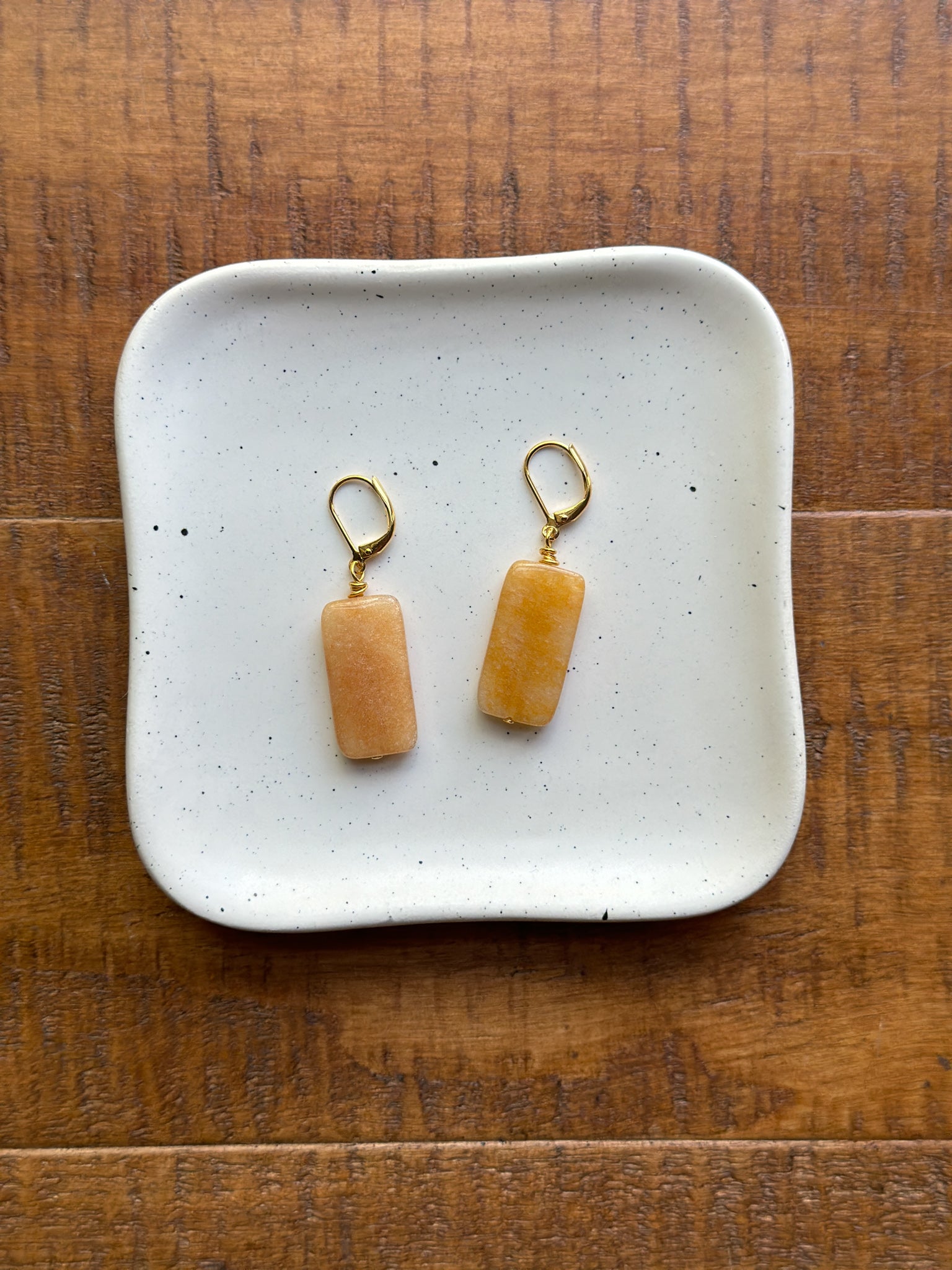 Yellow Jade Rectangle Pillow gemstone pendants with gold plated stainless steel lever backs. Pendants are 25mm long.